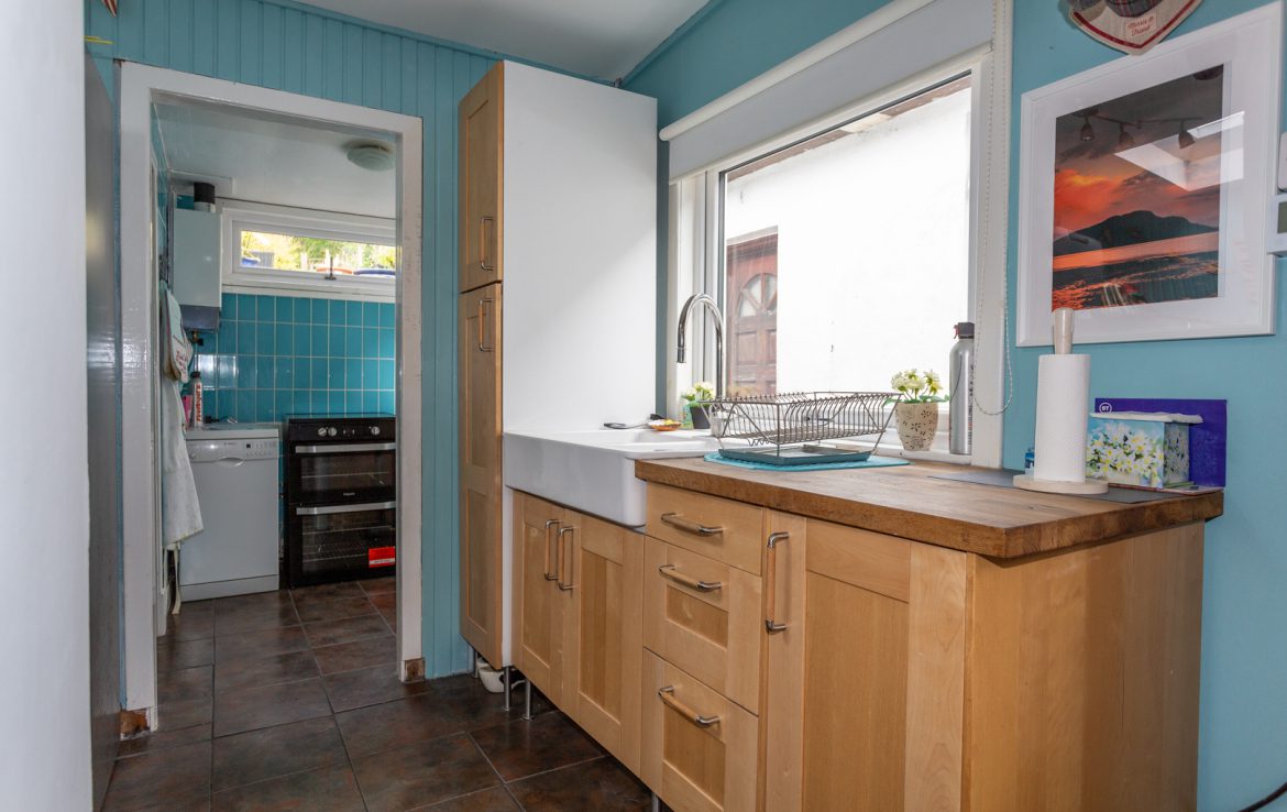 This house has an open plan living room/kitchen/utility room equipped with a wood burning stove, an induction cooker, dishwasher and washing machine.