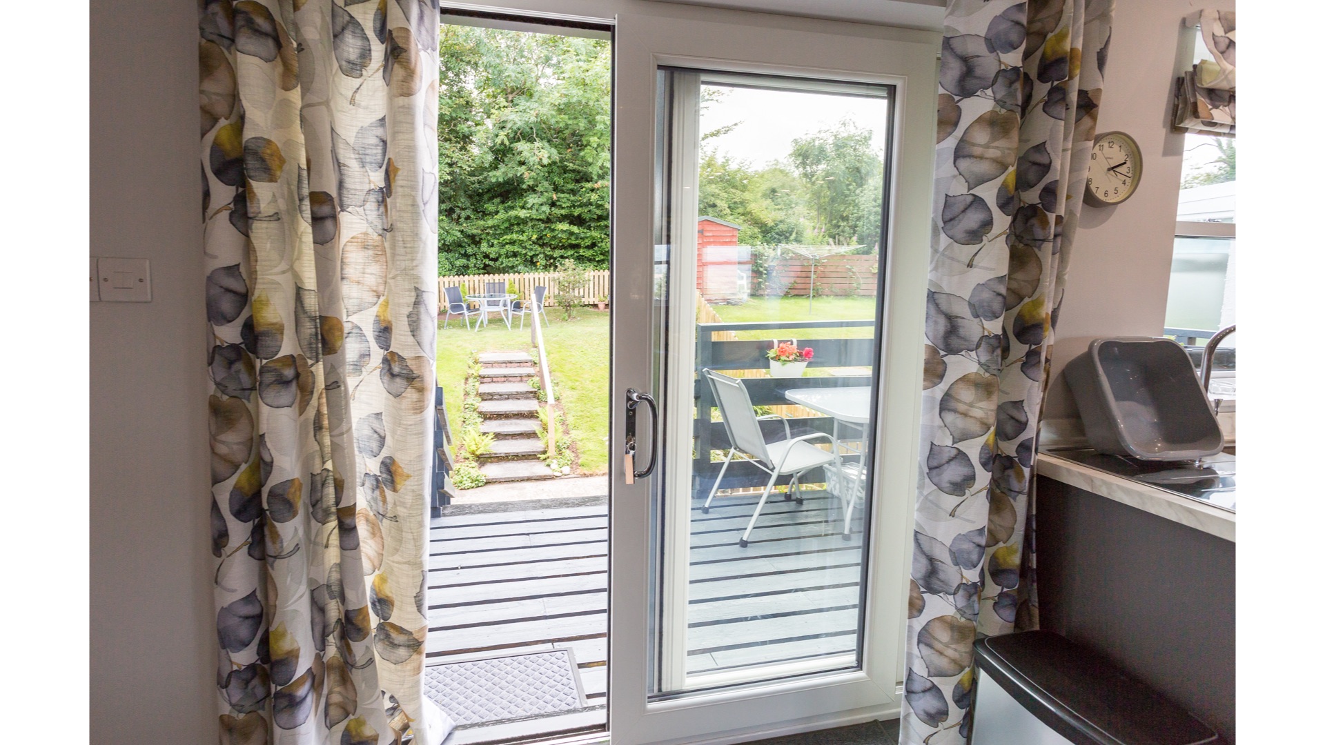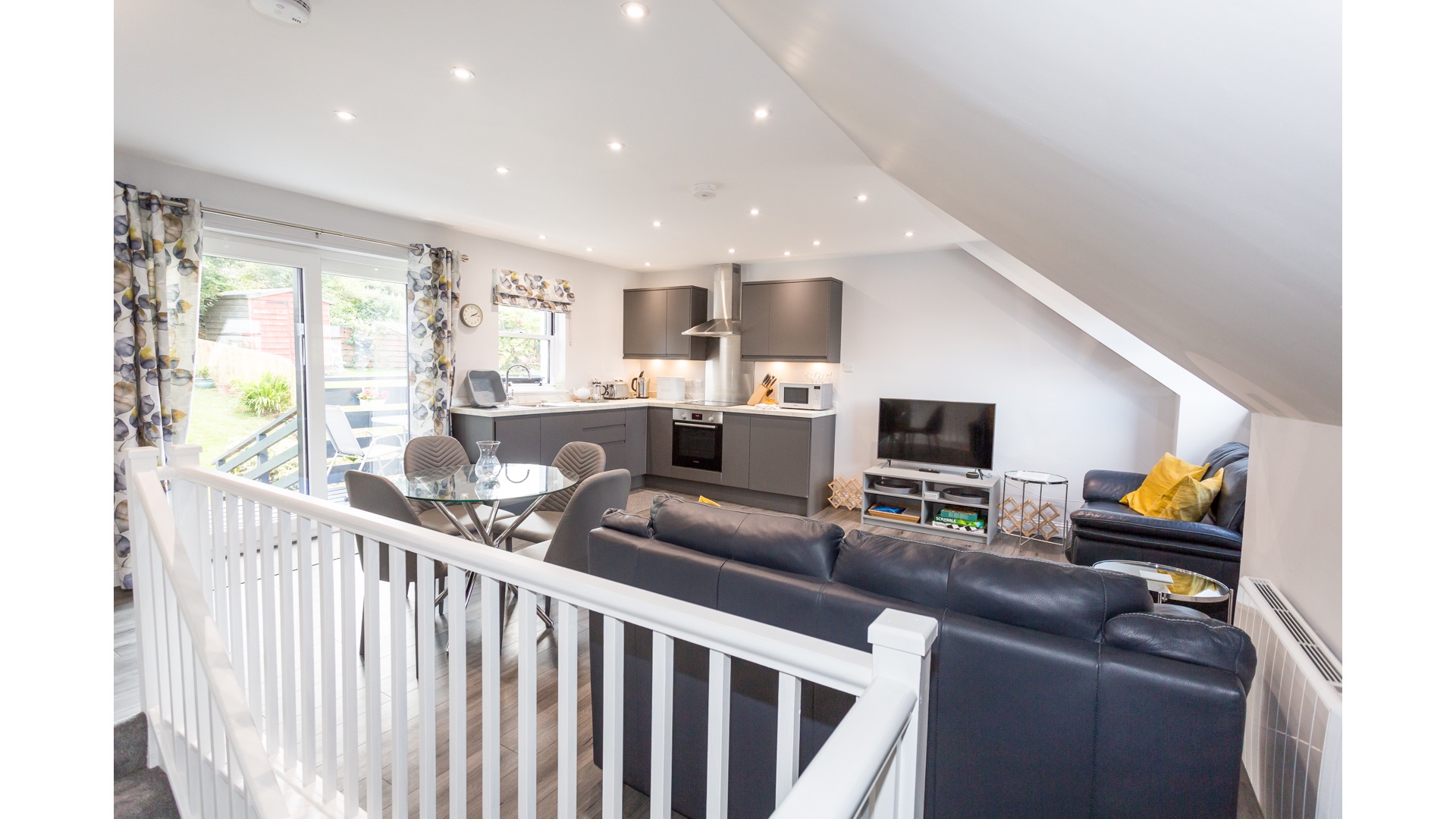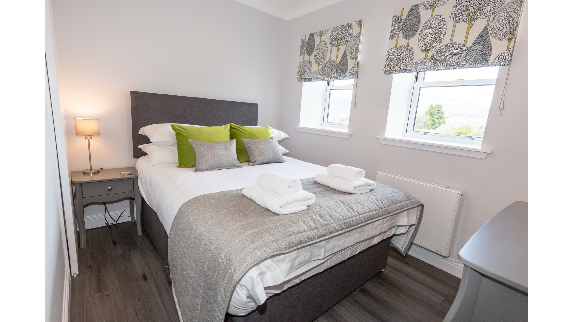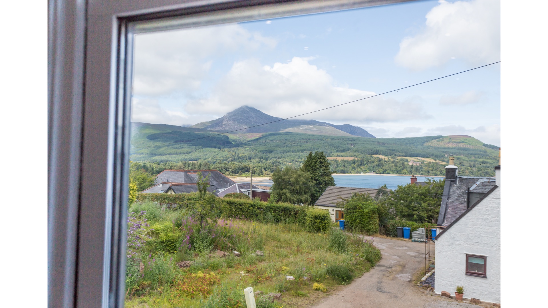 There are 2 double bedrooms and a bathroom with a walk-in shower on the ground floor. Upstairs, there is an open plan kitchen-diner and lounge, with impressive views across Brodick Bay to Goat Fell.