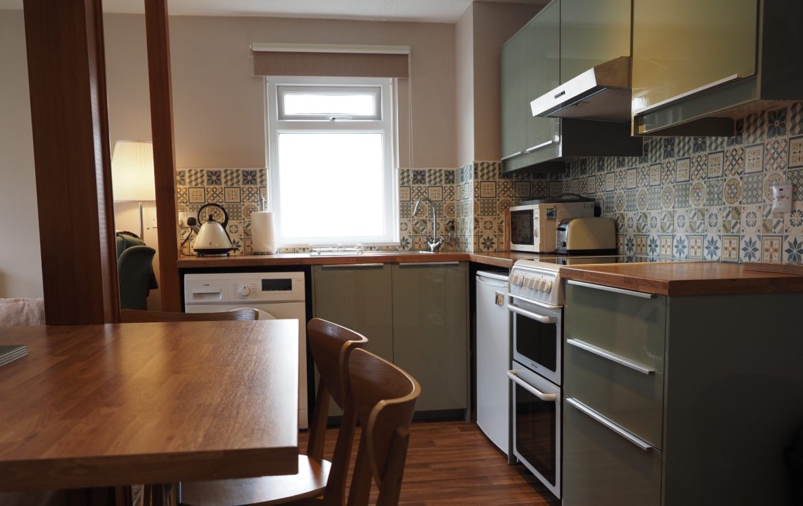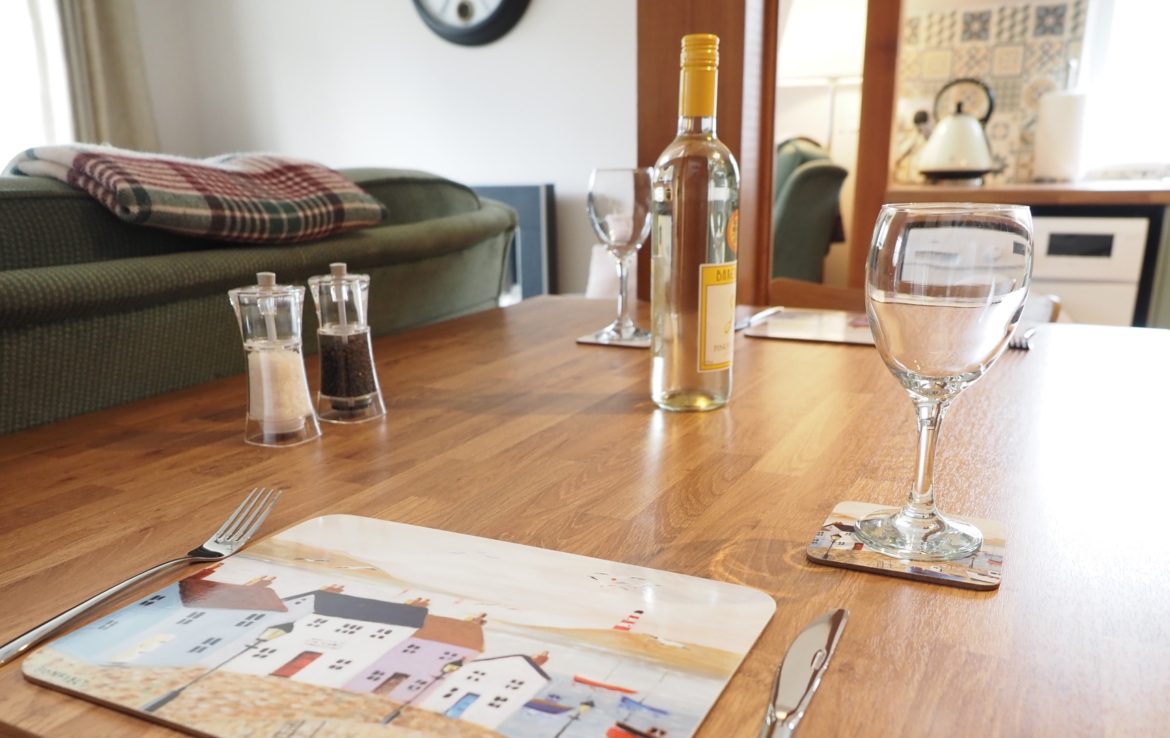 Dining area for four with plenty cutlery and crockery provided to meet the needs of self catering guests.