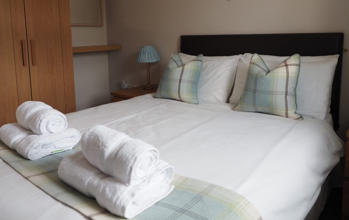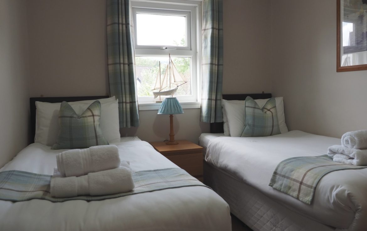 Bedroom 2 is a twin room having a shared beside table with drawers and lamp, wardrobe and a chest of drawers featuring a hinged vanity mirror.