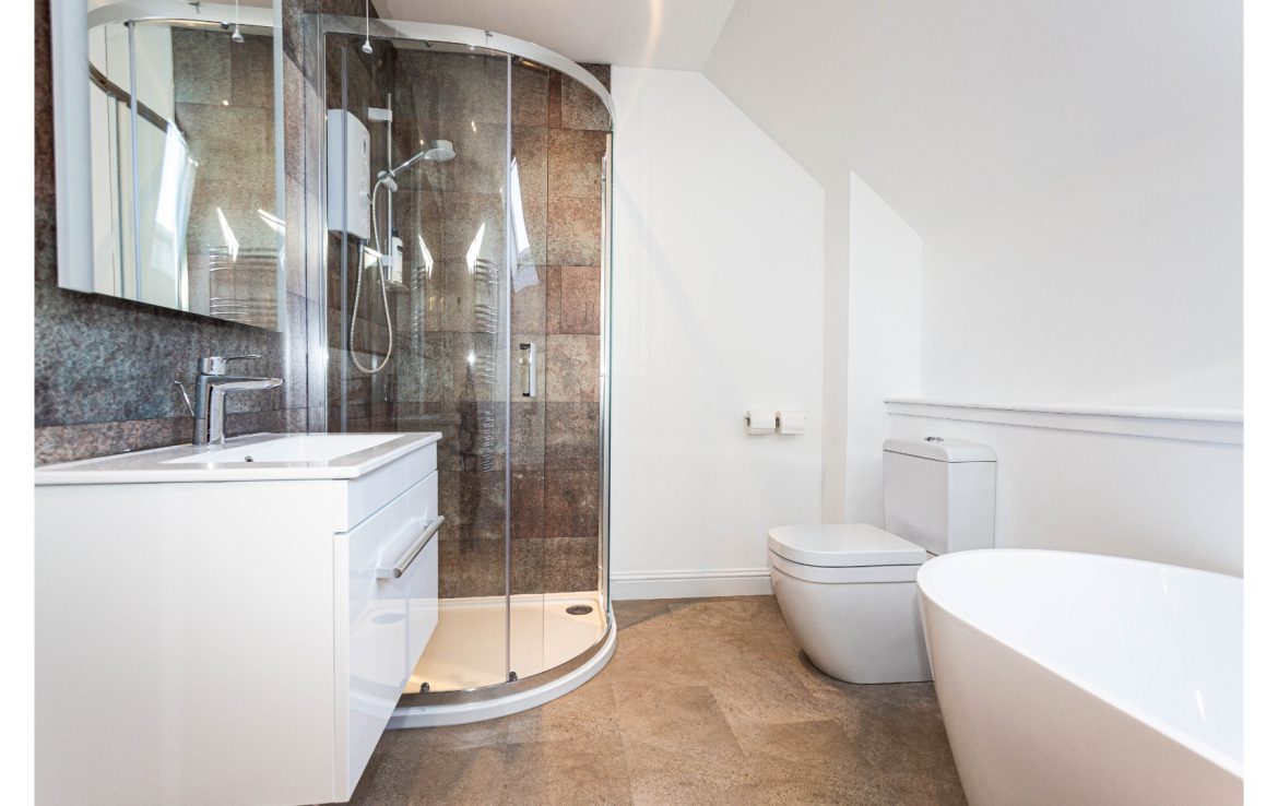 Upstairs there are 3 bedrooms: 1 twin, 1 with a 5’’ bed and one with a 6’’ bed en-suite shower room. Each bedroom includes a TV and a family bathroom includes a bath. All bed linen is included.