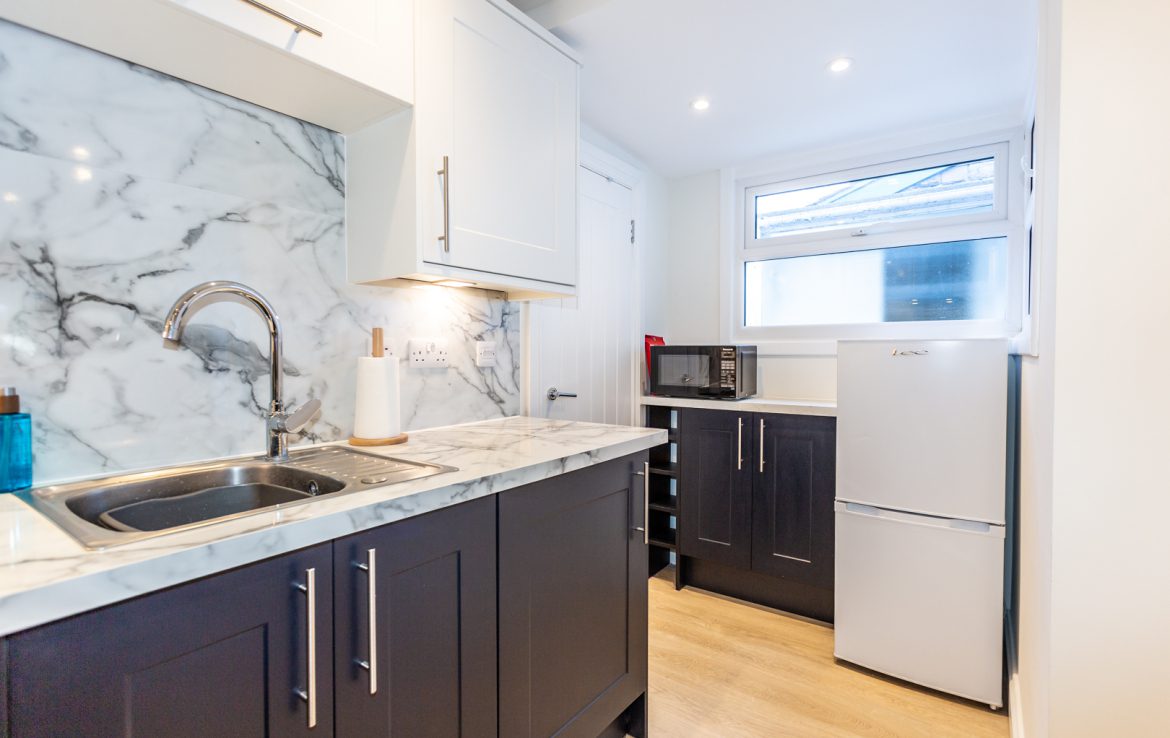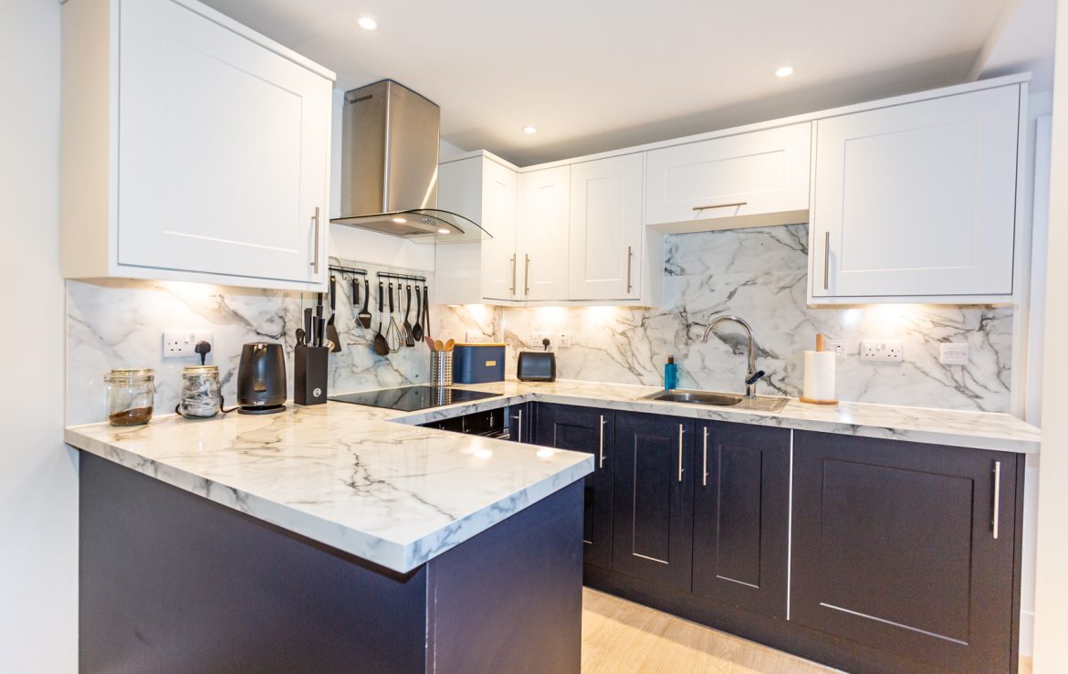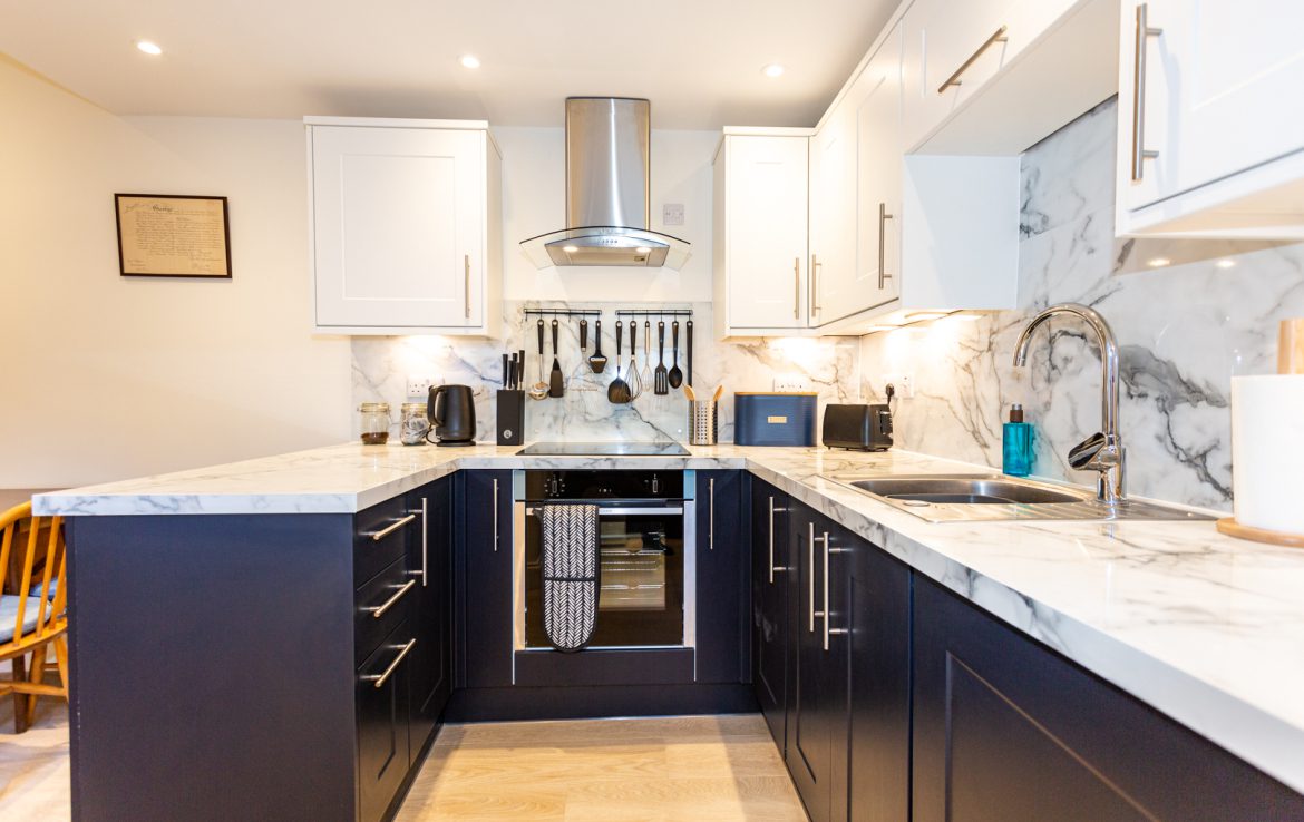 Newly fitted integrated kitchen incorporating electric oven, electric hob, fridge/freezer, and washing machine