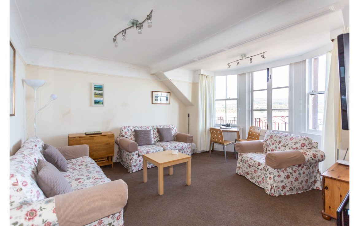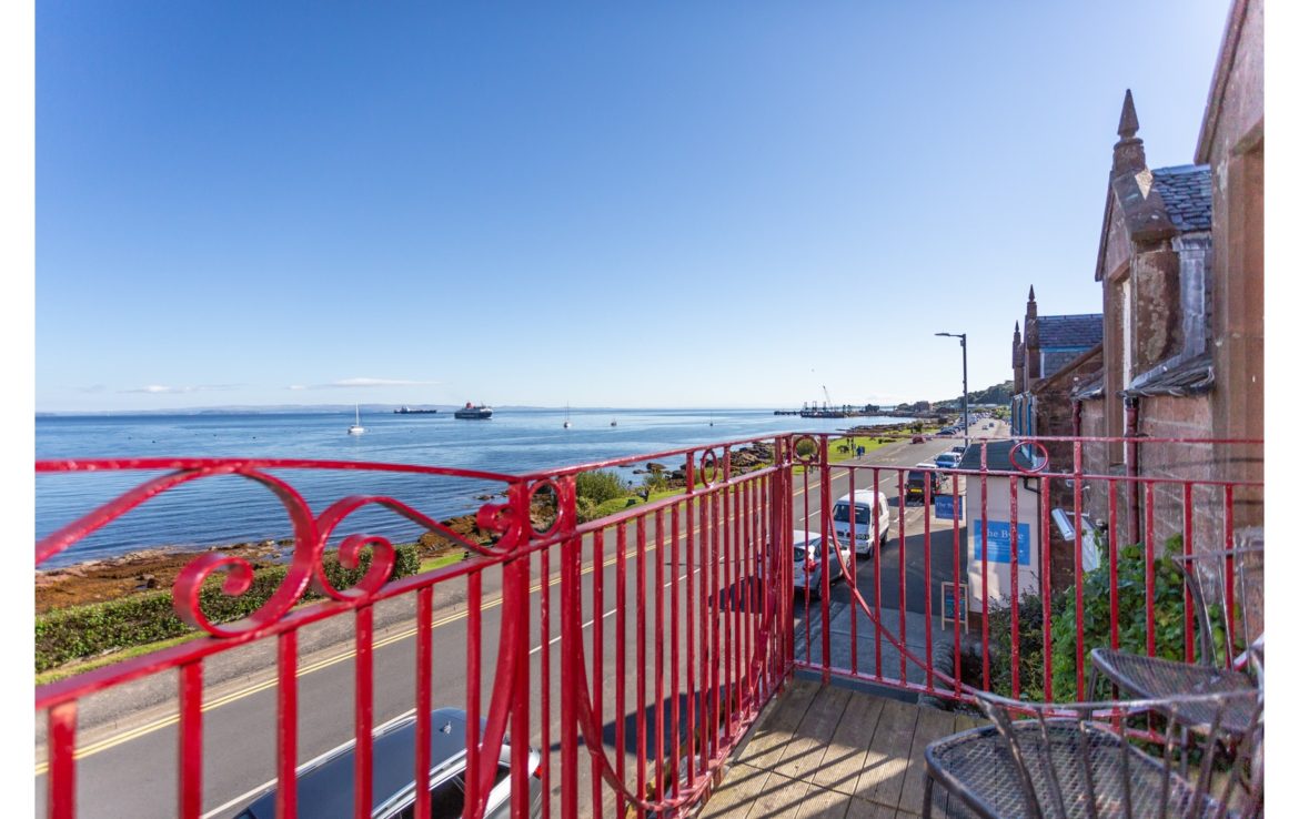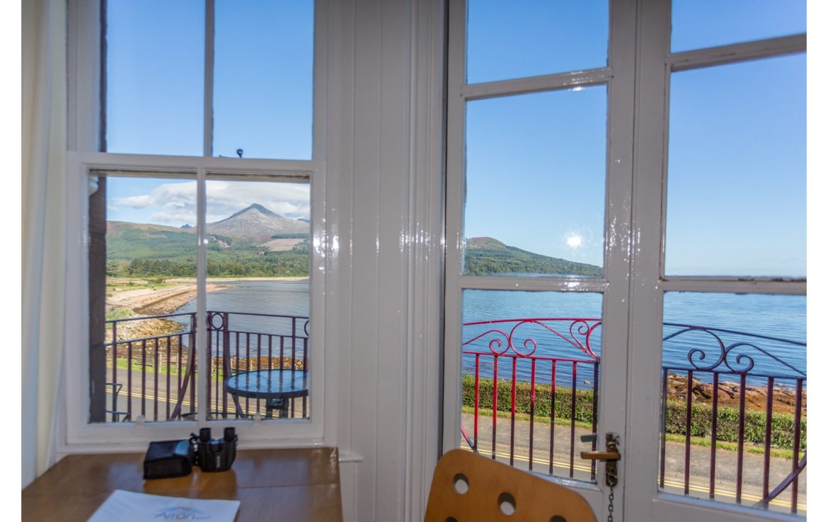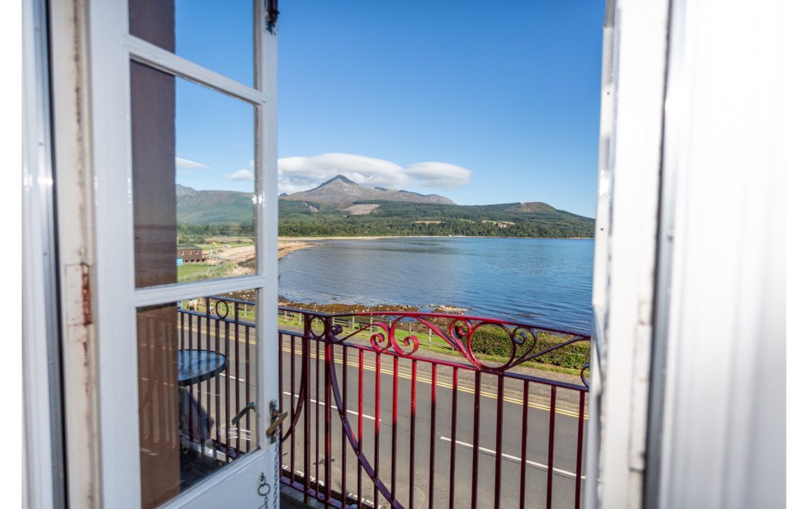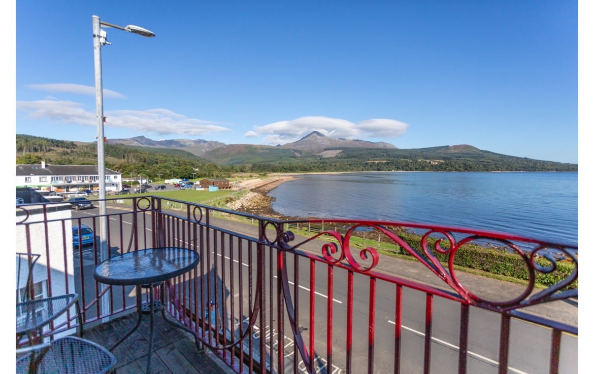 Balcony overlooking Brodick Bay to Goatfell and Brodick Castle