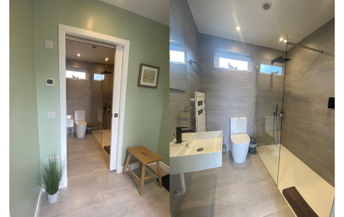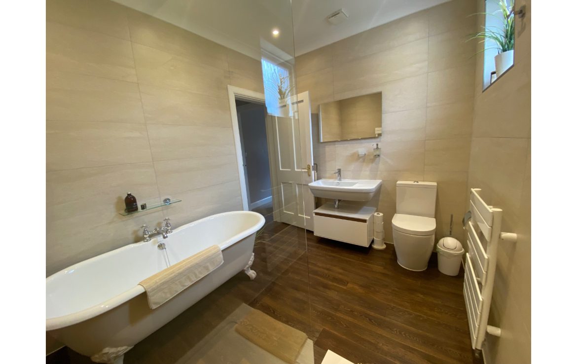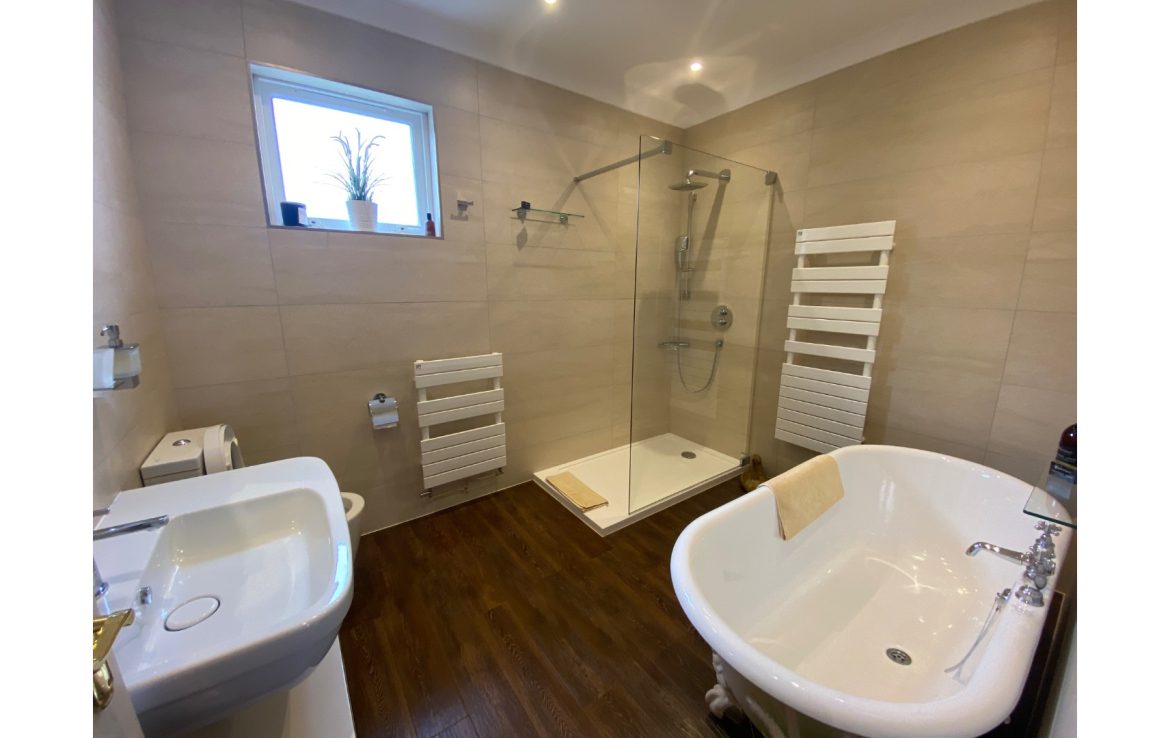 Full bathroom including a roll top bath, walkin shower, wash hand basin, WC and heated towel rail.