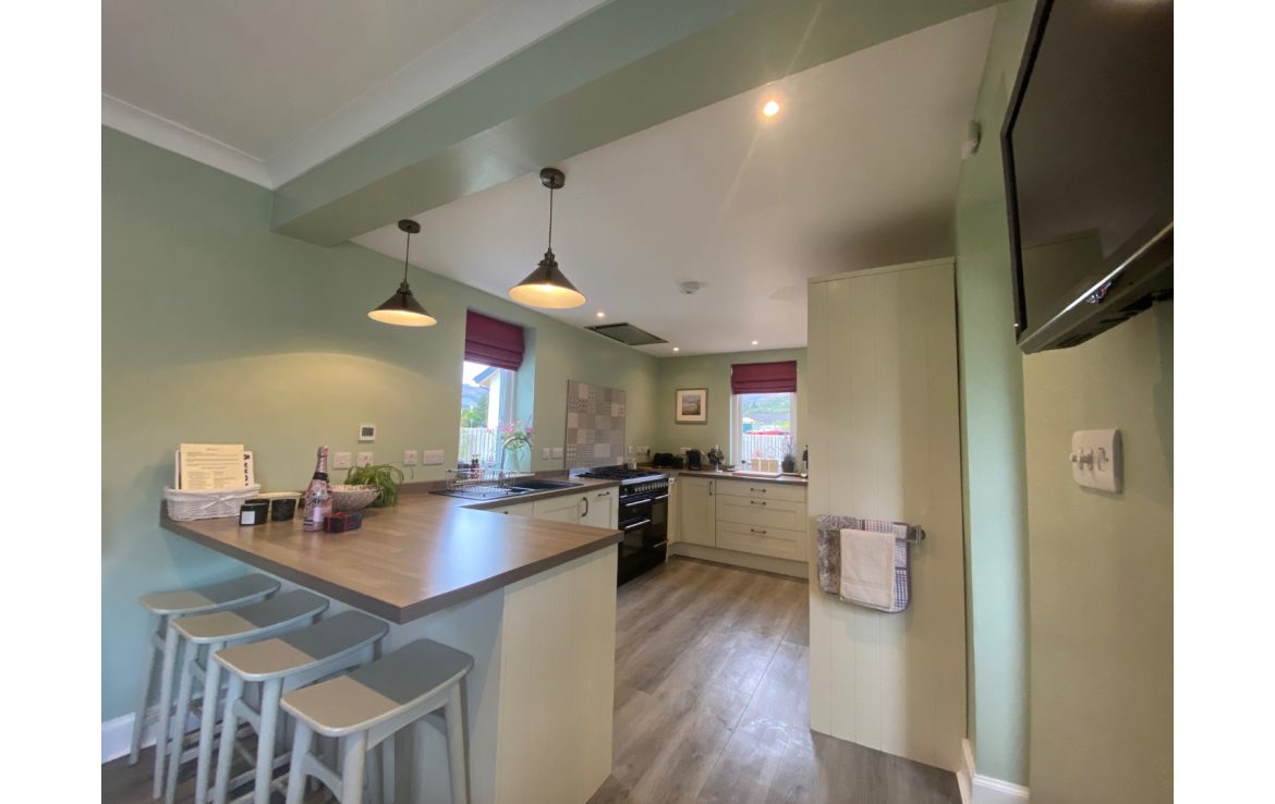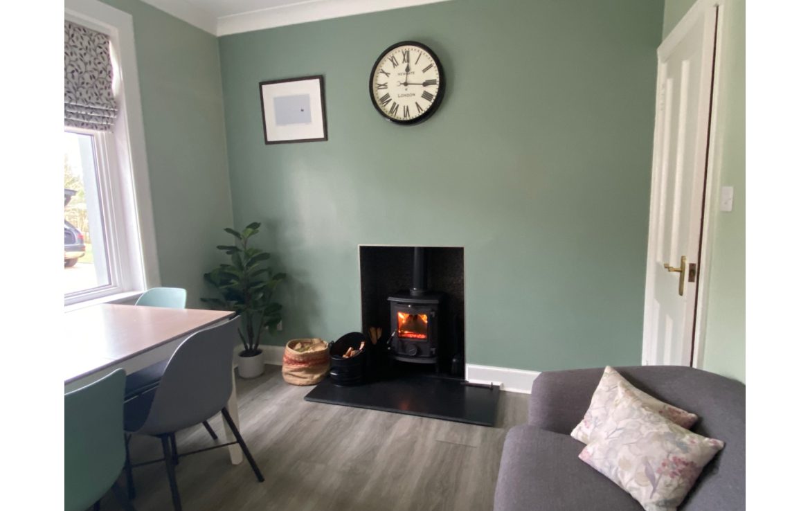 The kitchen is very well equipped with a 6 burner cooking range, full size fridge freezer, dishwasher, microwave and Nespresso coffee machine. The kitchen leads to an open plan dining area with a multi fuel burner.