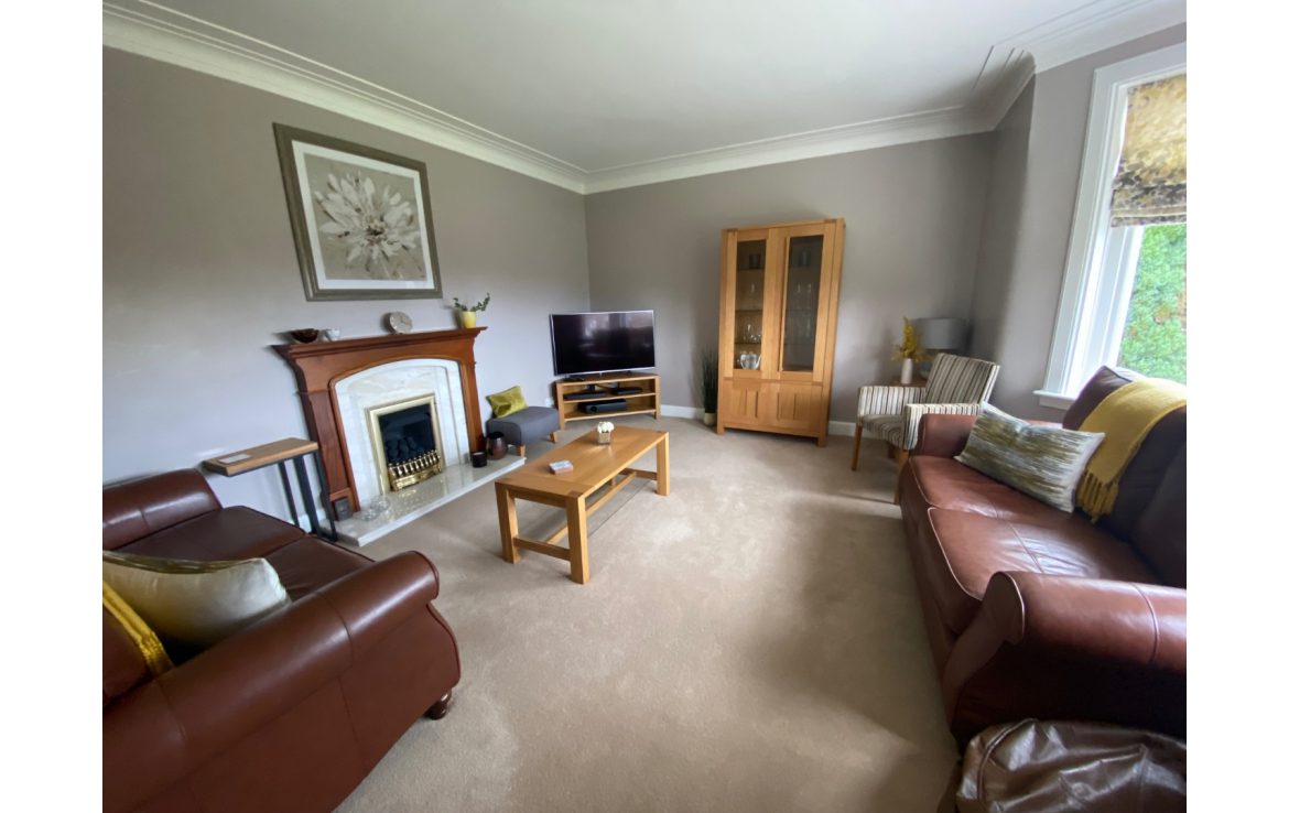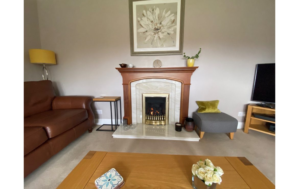 The lovely lounge includes a bay window, leather sofas, gas fire and satellite TV.