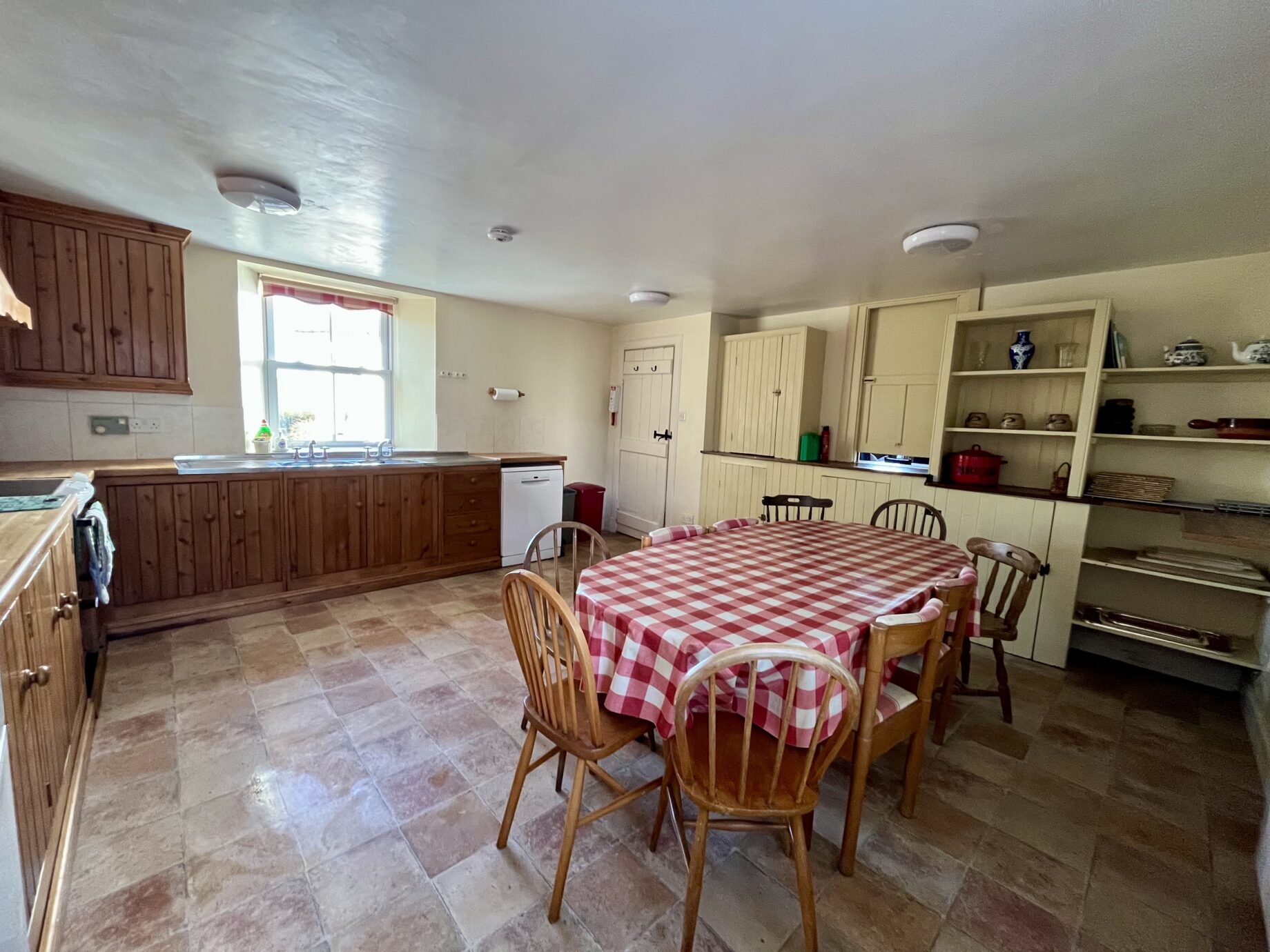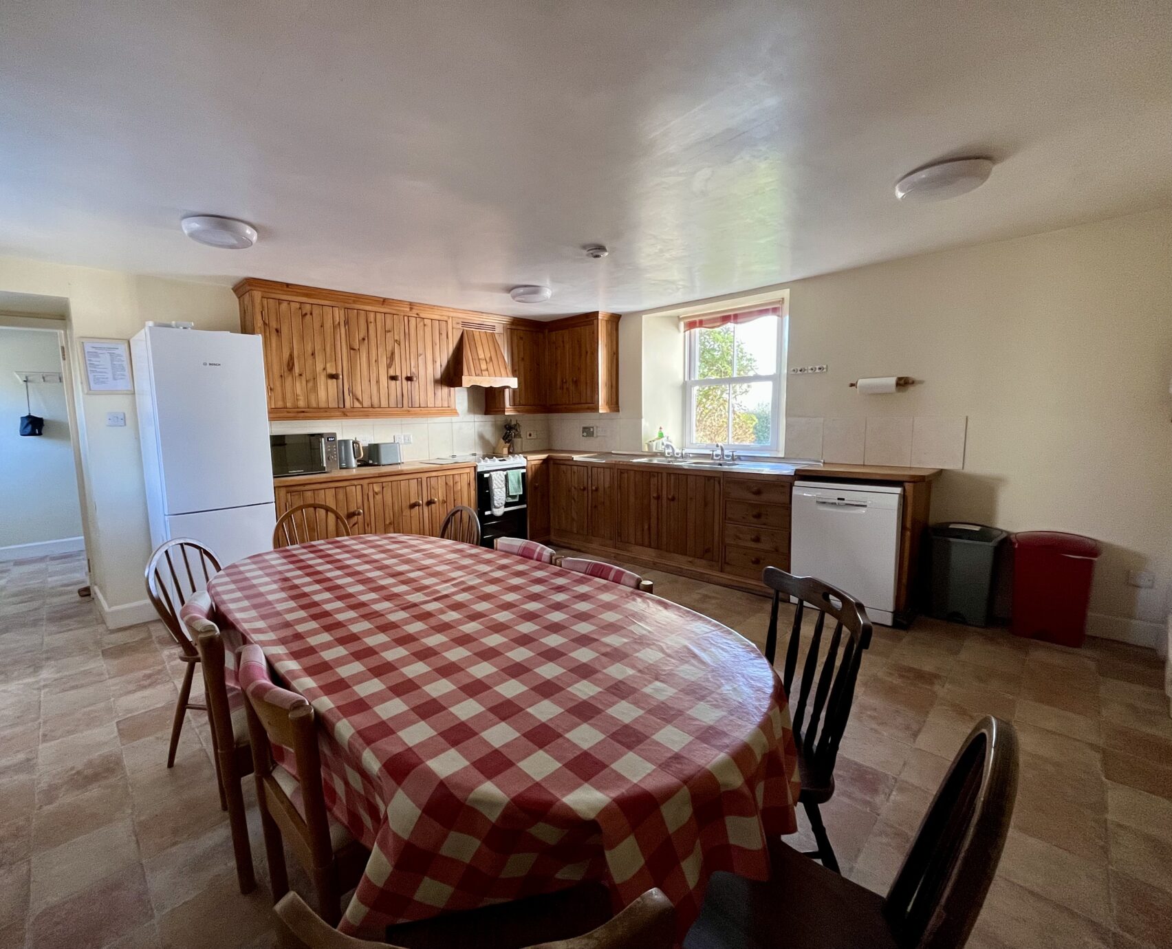 - The fully fitted kitchen has equipment which includes electric cooker, fridge/freezer, dishwasher, microwave, and double stainless-steel sink. There is also a large kitchen table.