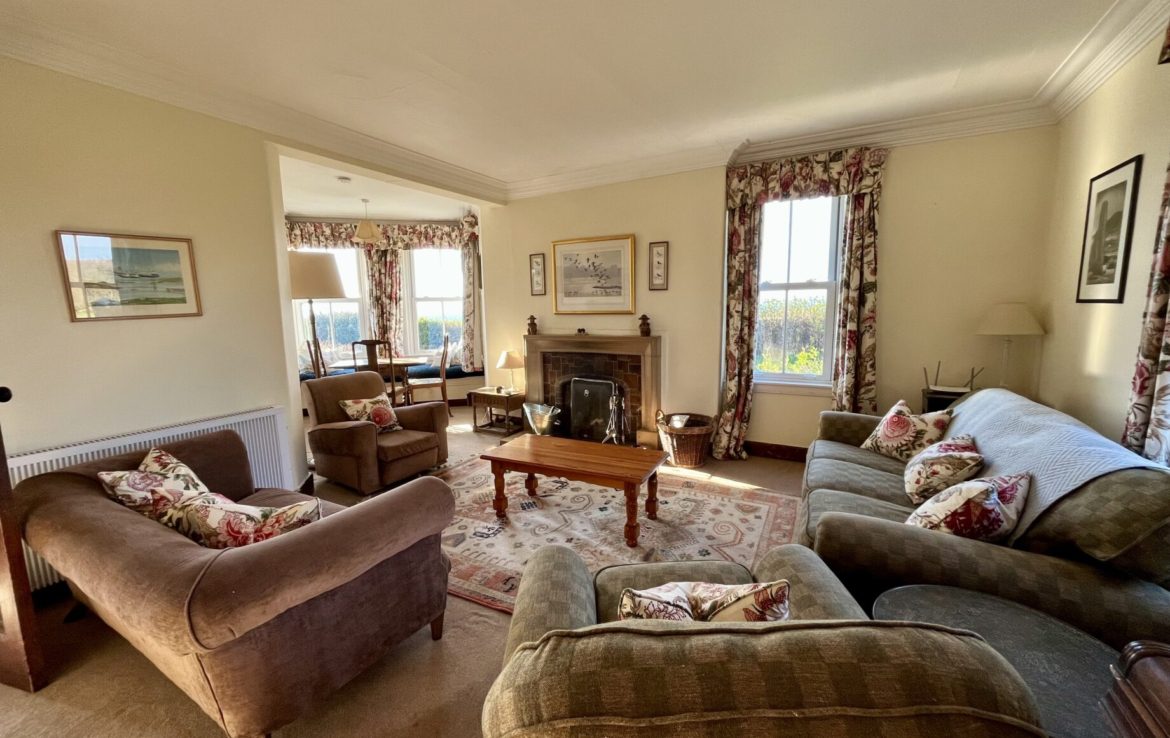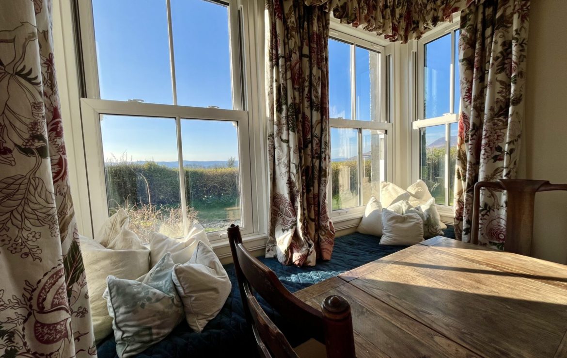 The main sitting room is spacious with an open fire and a bow window, with fine views across the Kilbrannan Sound to Kintyre. The Wi-fi router is in this room.