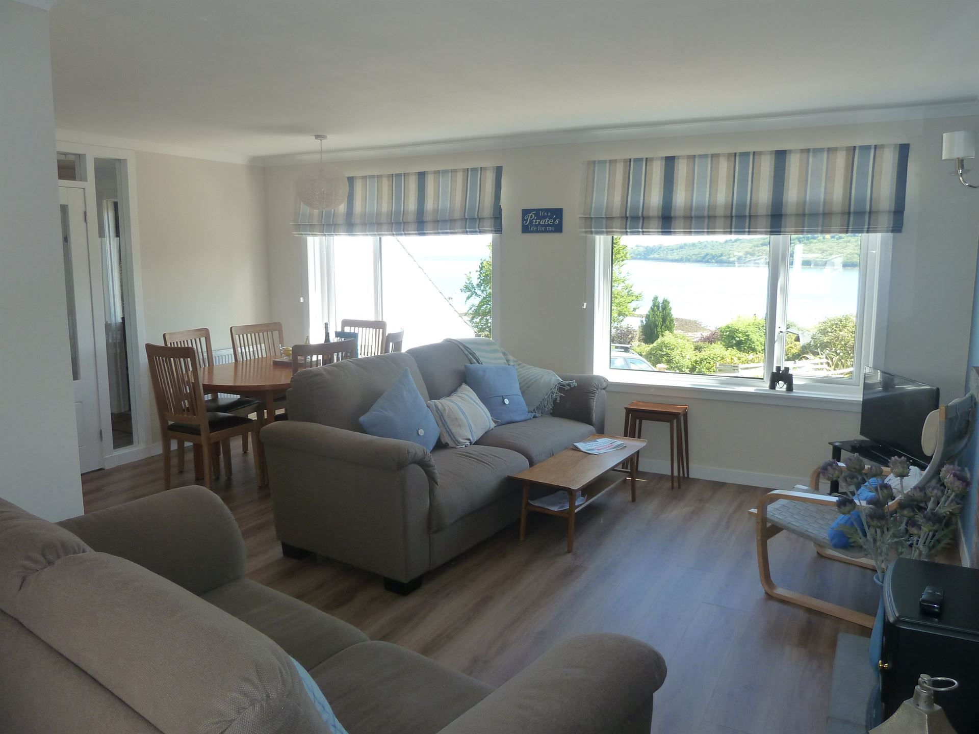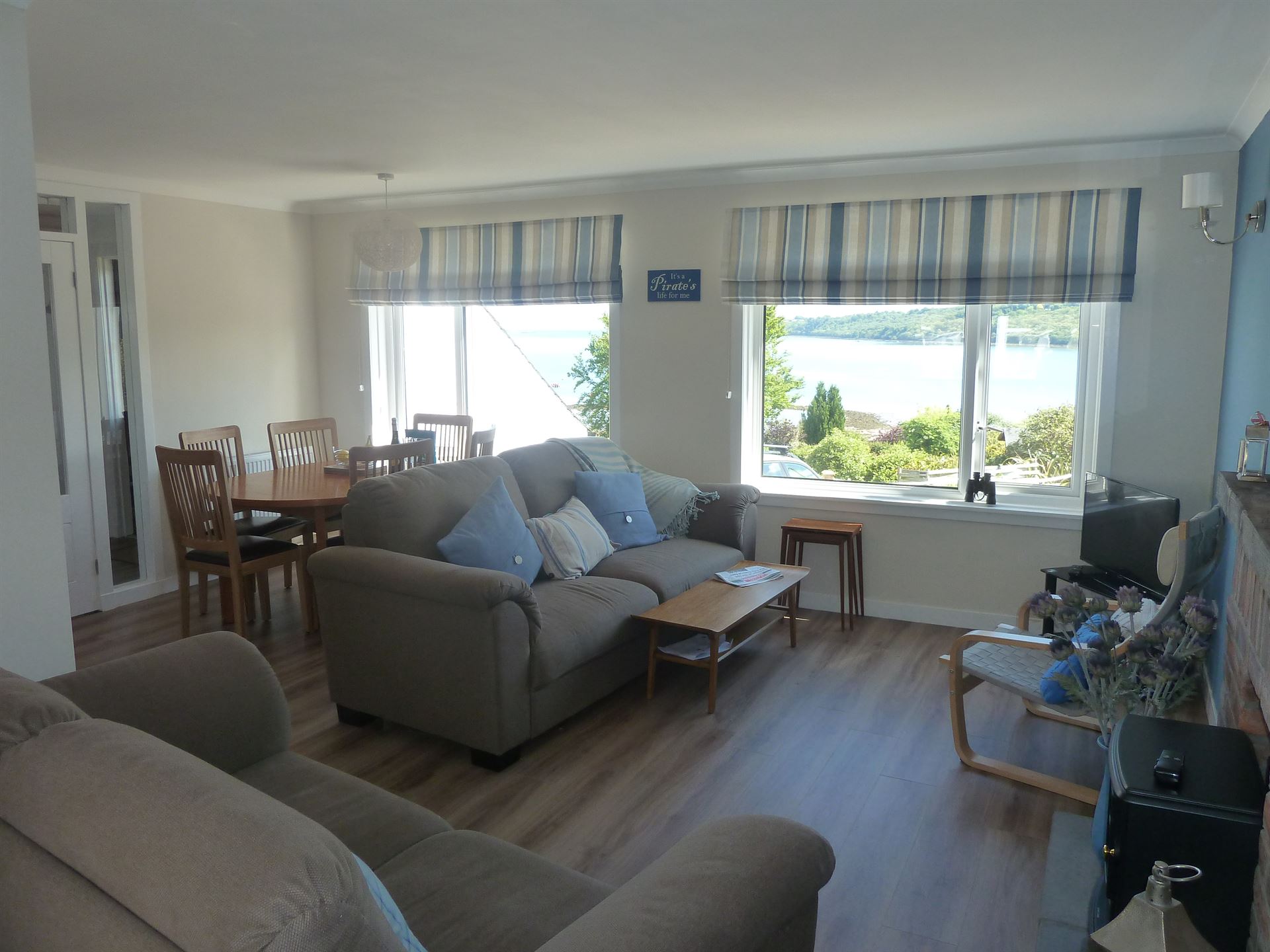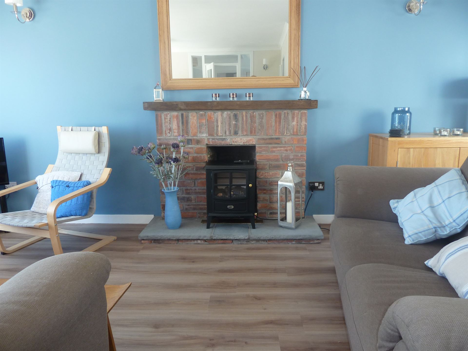 - Large L shaped lounge and combined dining area with large 2 and 3 seater sofas and chair; fireplace with stove style electric fire; dining table and seating for 6; Free view Television: