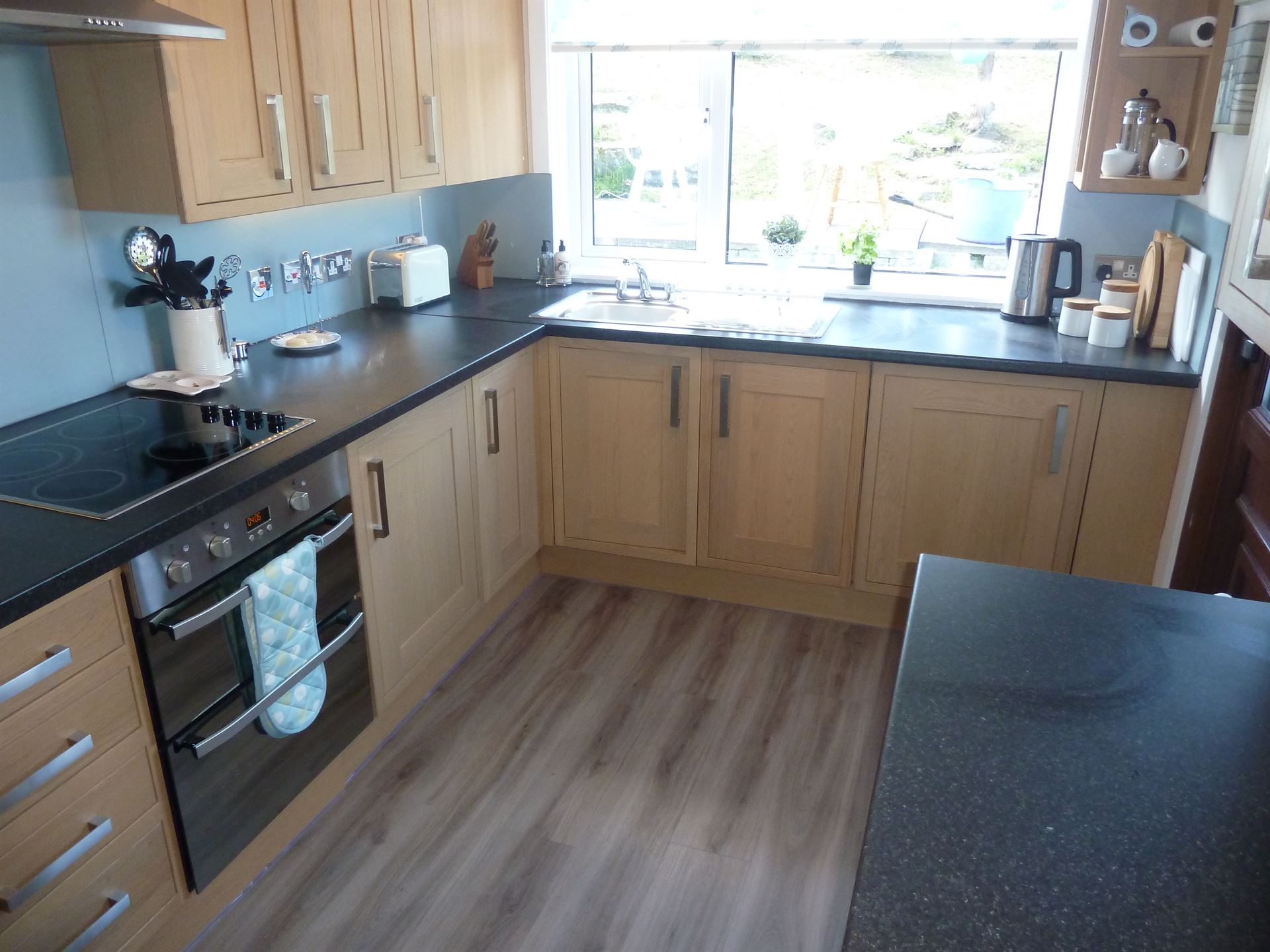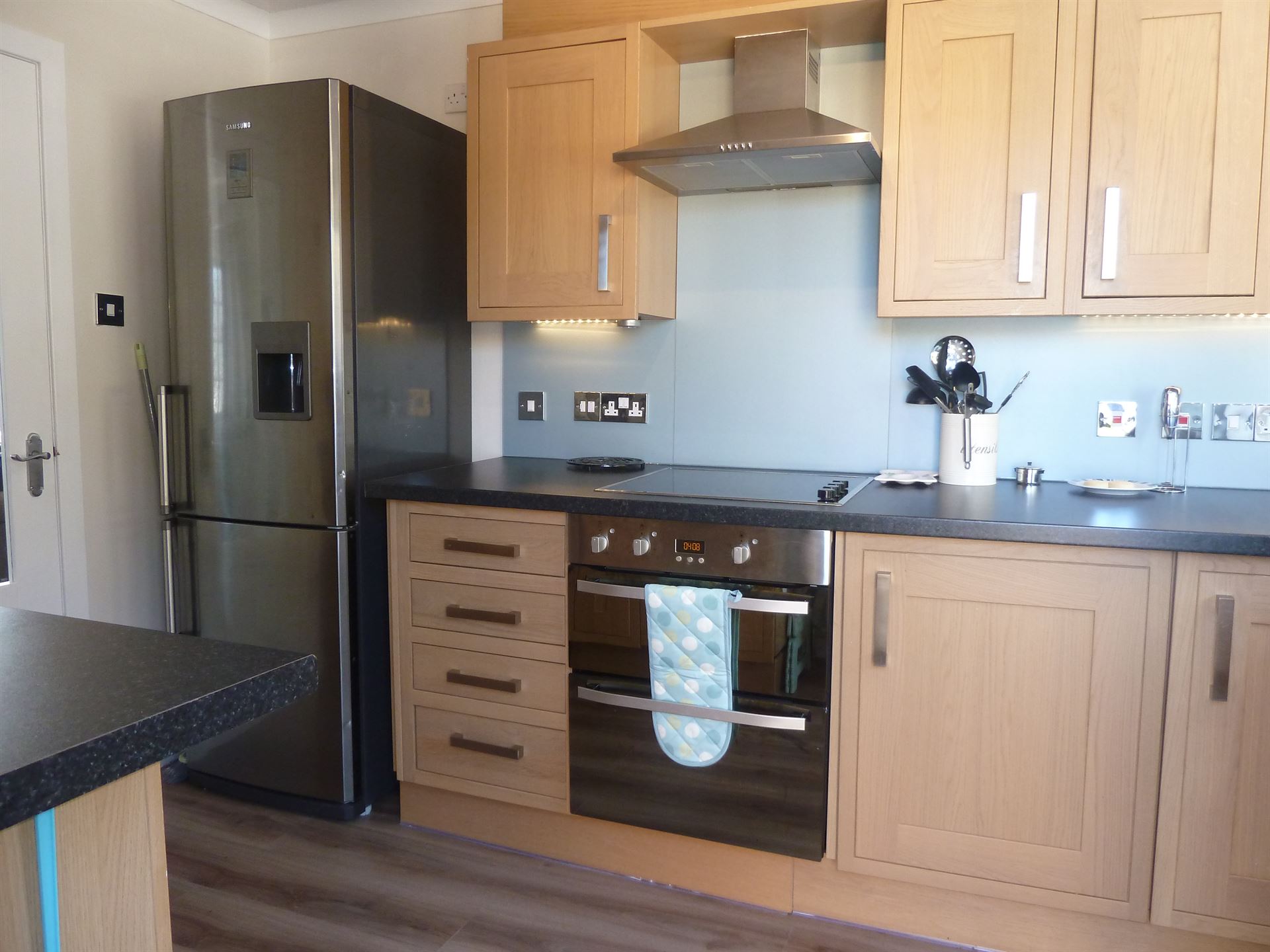 - Double fan oven and grill with electric ceramic hob and extractor unit