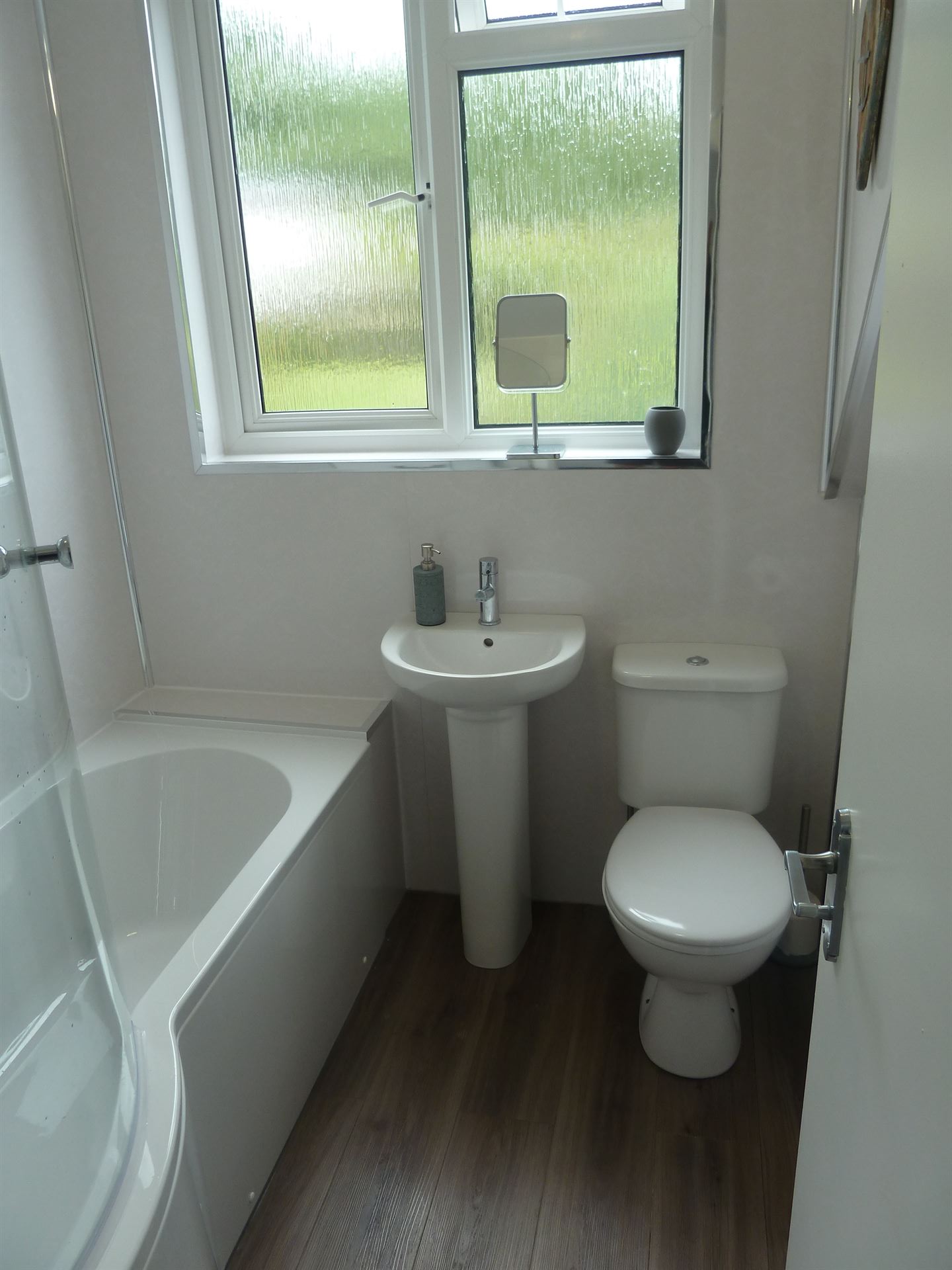 - Toilet and Bathroom with WC, sink , P shaped full size bath with shower screen with power shower & large heated towel rail.