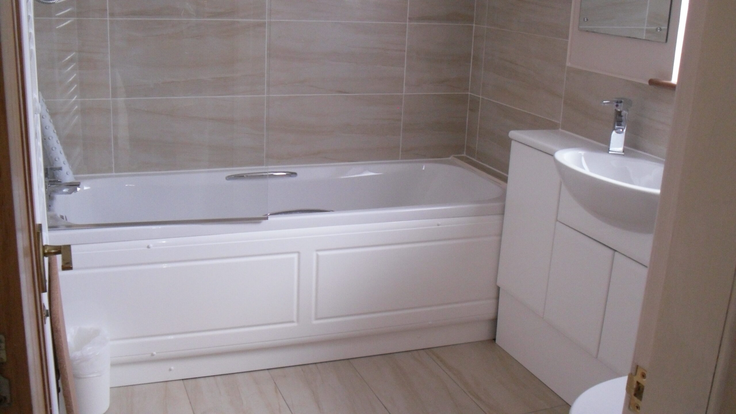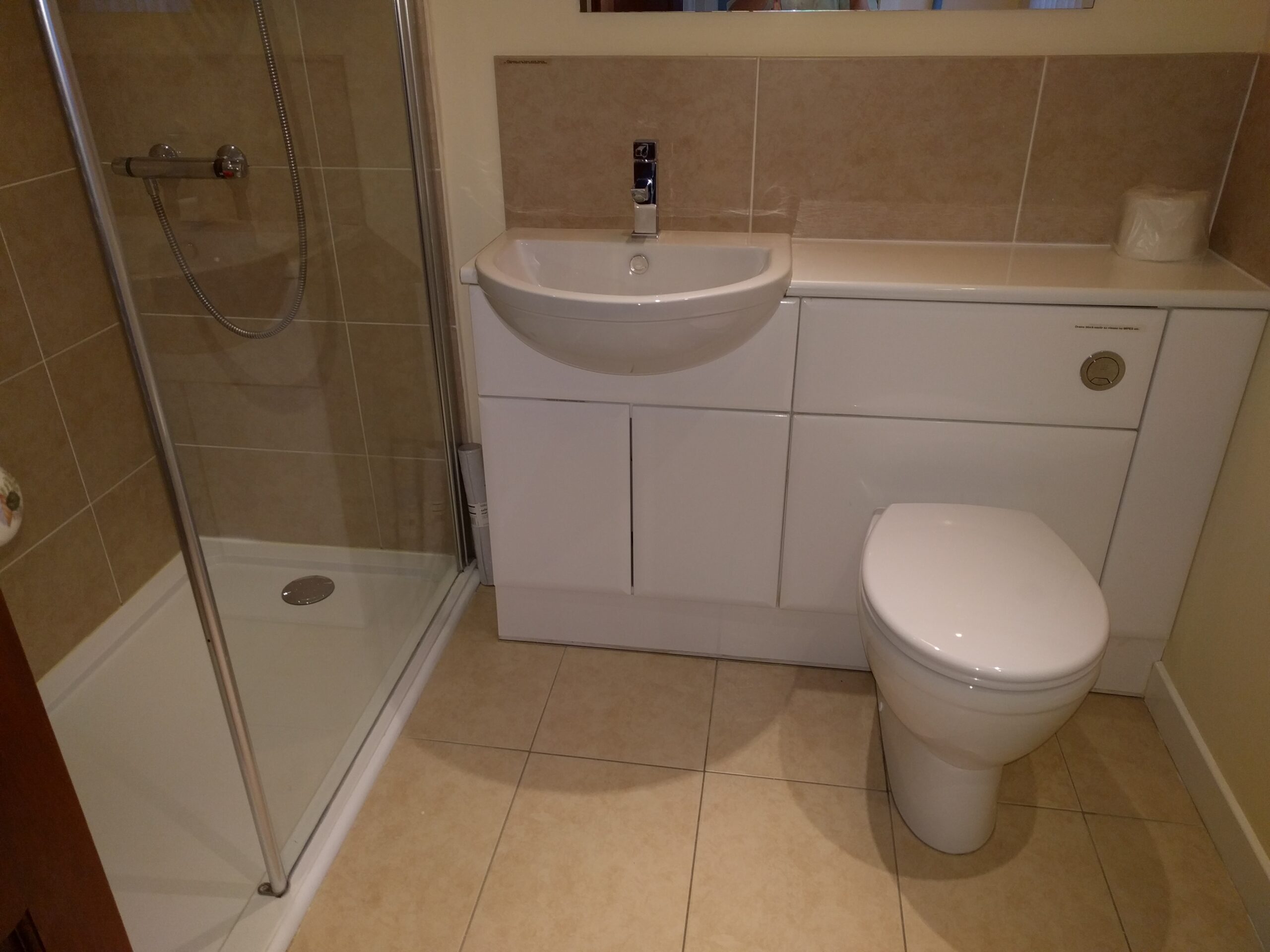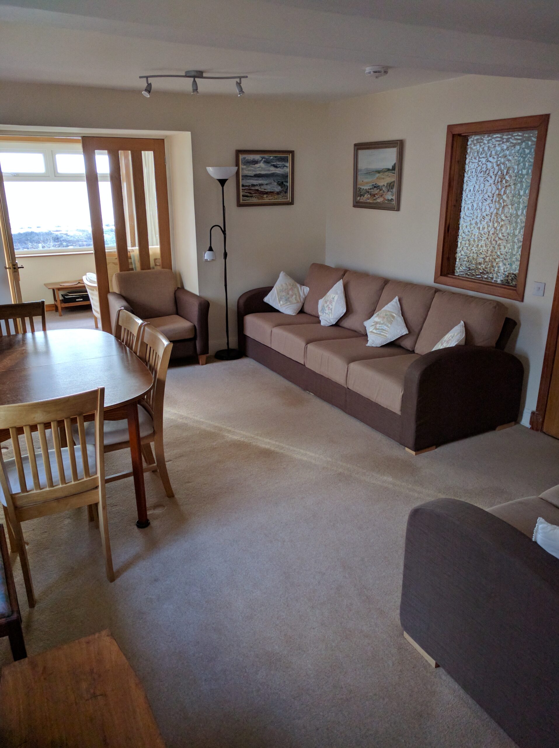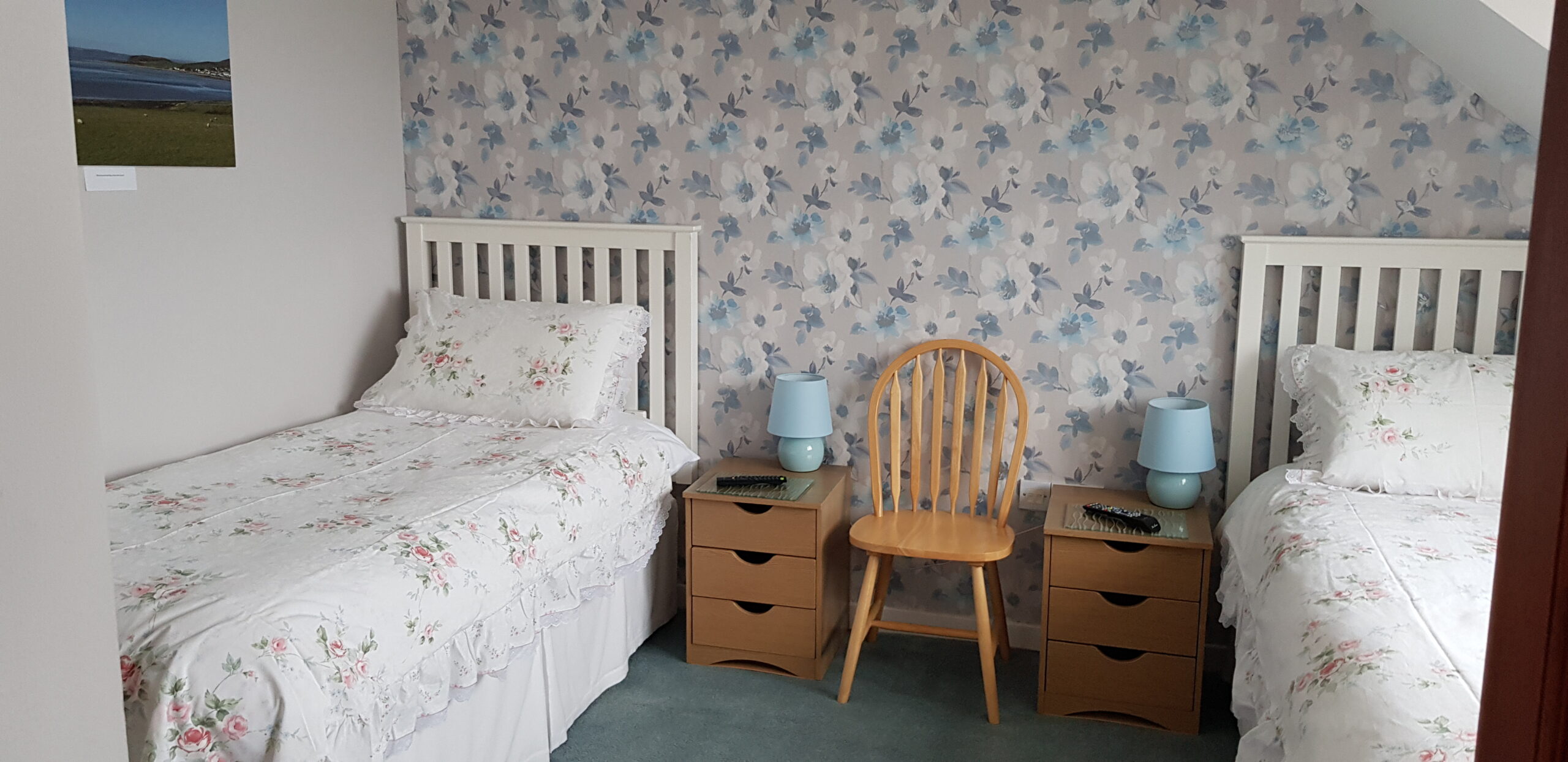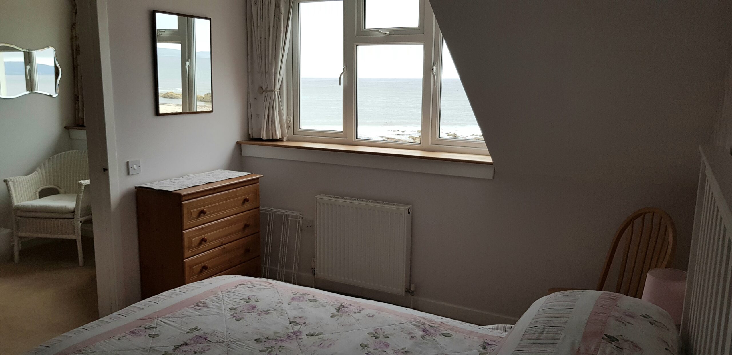 - 3 bedrooms upstairs – 1 twin bedroom and 1 double bedroom both facing the sea, and the 2nd twin room, although small, has two single beds, fitted wardrobe & TV.