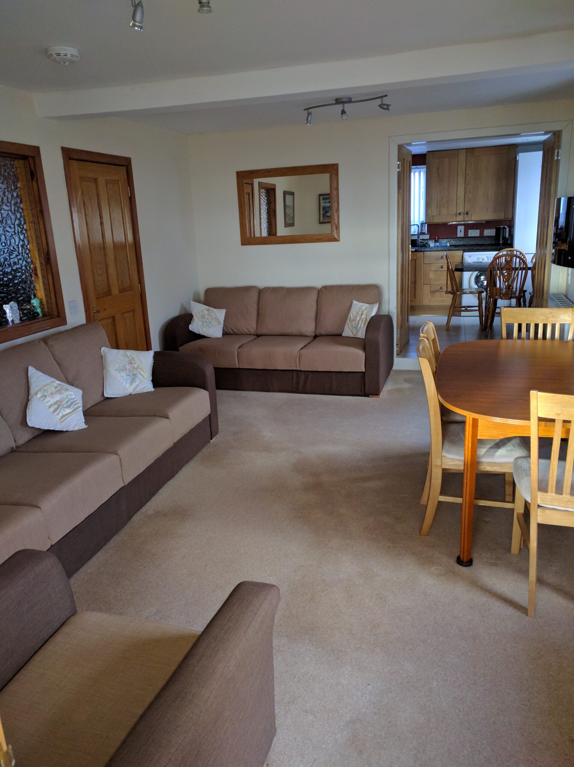 Duvets, pillows and bed linen are provided but towels are required. - 3 shower/bathrooms – 1 shower is the en suite off downstairs bedroom, 1 over bath shower downstairs, 1 large shower upstairs.