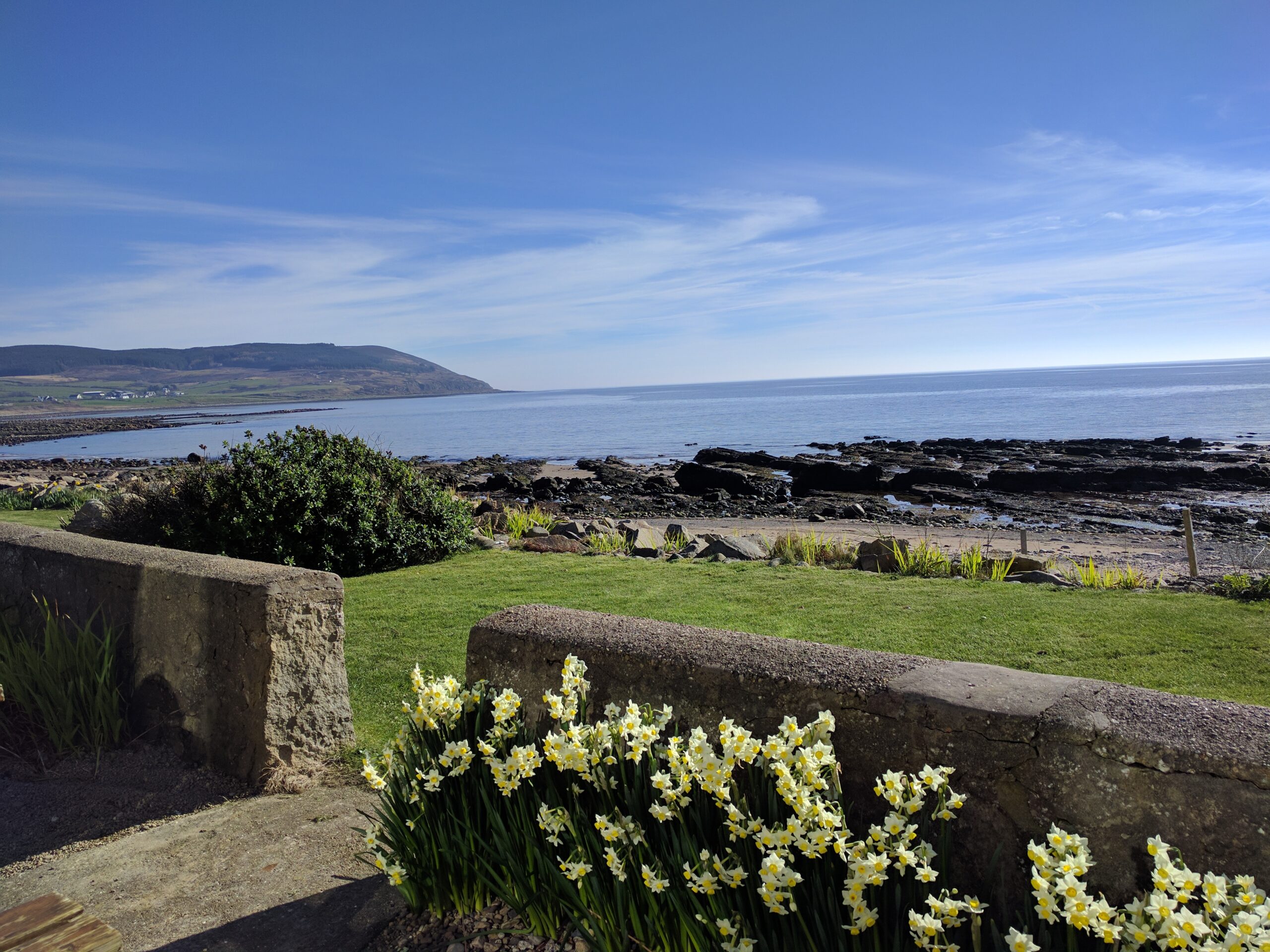 - Outside, the large garden looks onto the shore, with a driveway to the side, and is all enclosed from the road. There are flat grassy areas and a sheltered area looking onto the sea.