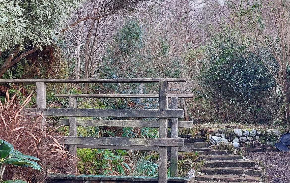 Secluded back garden with stream, bridge and garden seating seating. Guests with young children please be aware of the stream and do not leave children unattended.