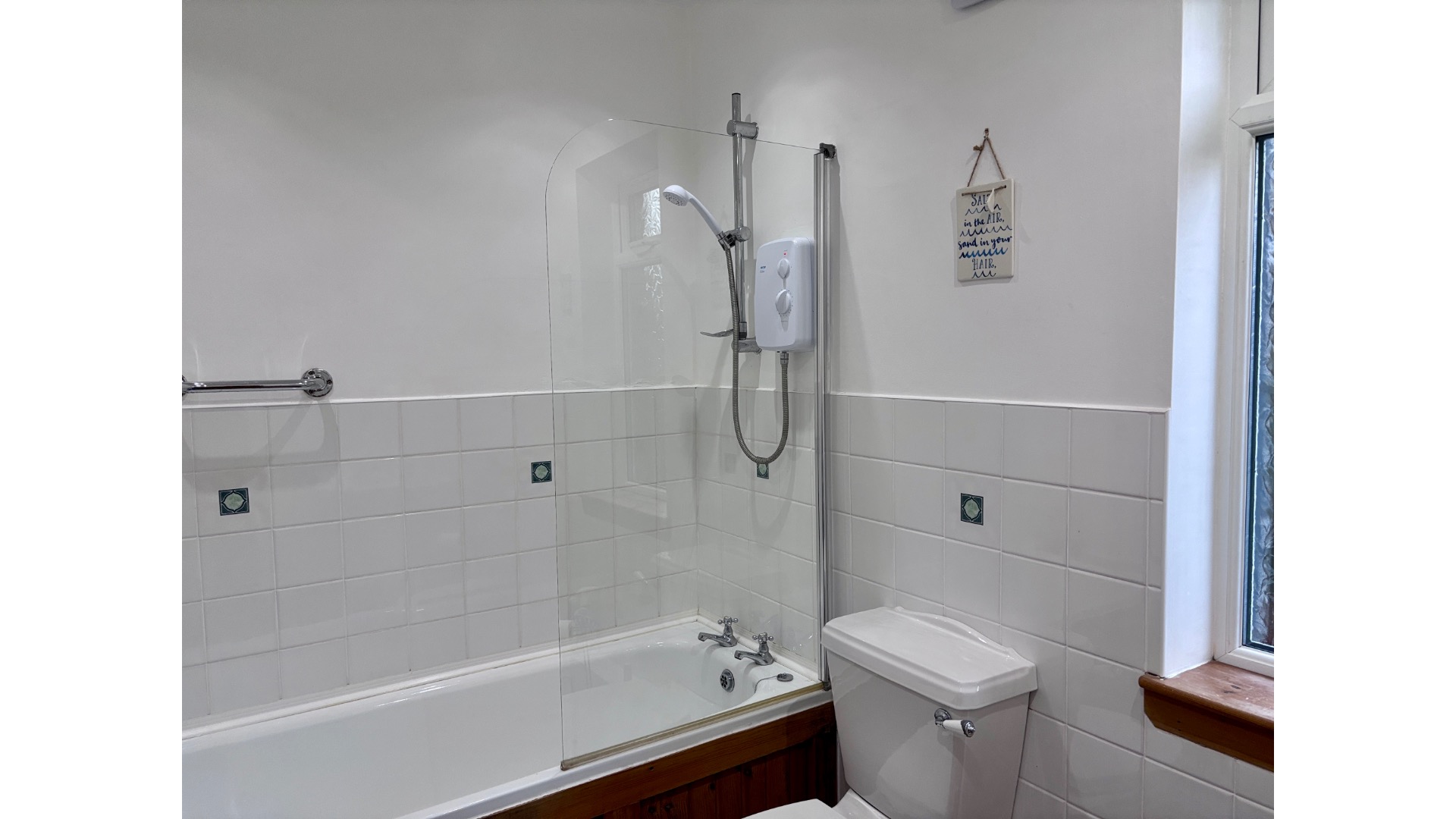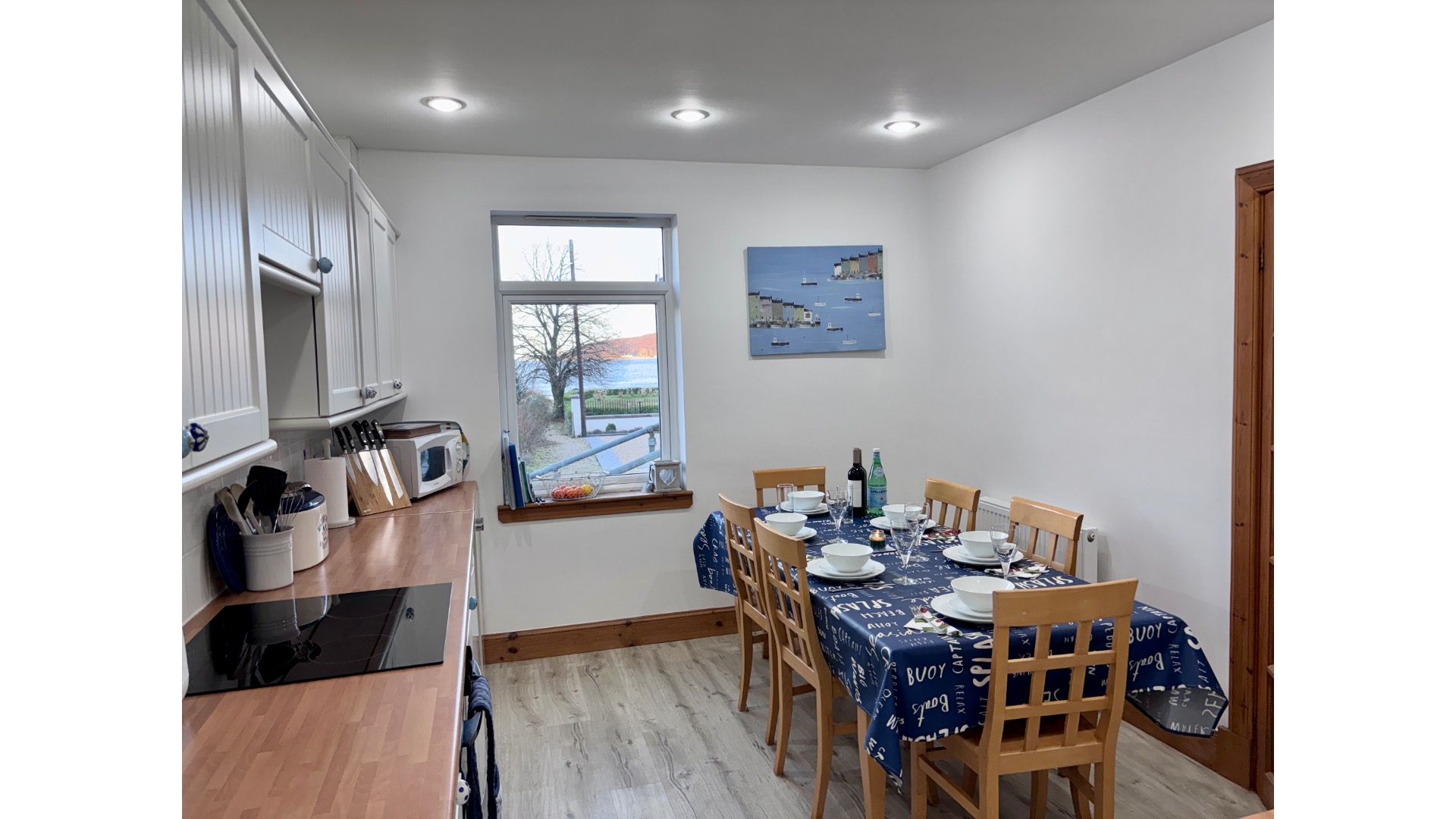 Downstairs, the spacious front lounge is a comfortable spot to relax or play family games. There is an adjoining living room with television, DVD player and games/books for your enjoyment. The spacious dining kitchen is fully equipped for self- catering featuring an oven, induction hob, fridge, freezer, microwave and dishwasher. The family bathroom has an over-bath electric shower.