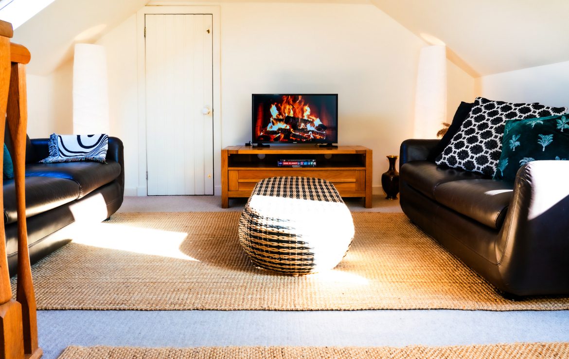 Living room lounge – 2 comfy sofas, and great views from the skylight window over Brodick Bay to Goatfell. HD TV with a wide range of TV channels