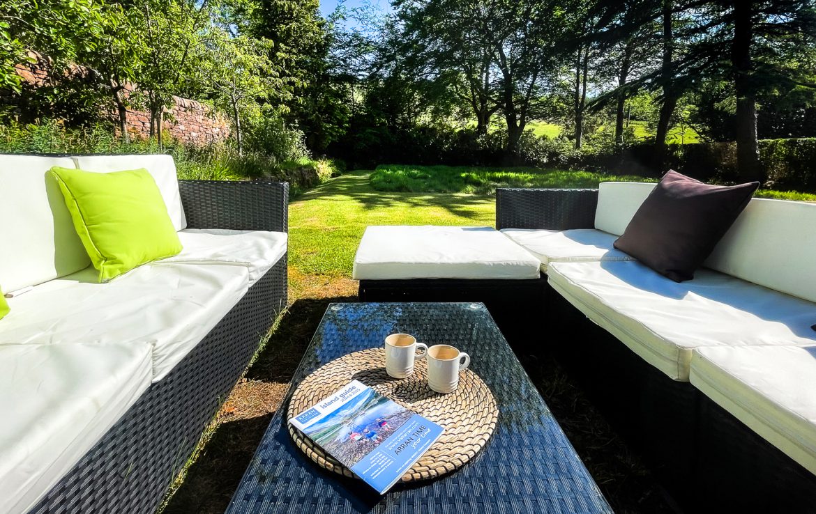 Couches and a table for chilling in the garden. As well as sun loungers, yoga mats, badminton set