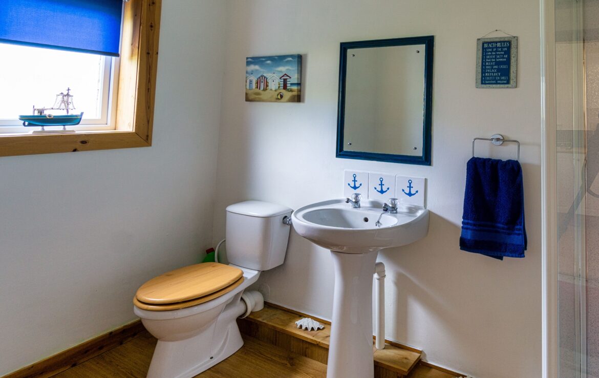 Bright spacious shower room with WC, wash hand basin, large storage seat for ‘after shower’ dressing, tall toiletries cabinet and heated towel rail.