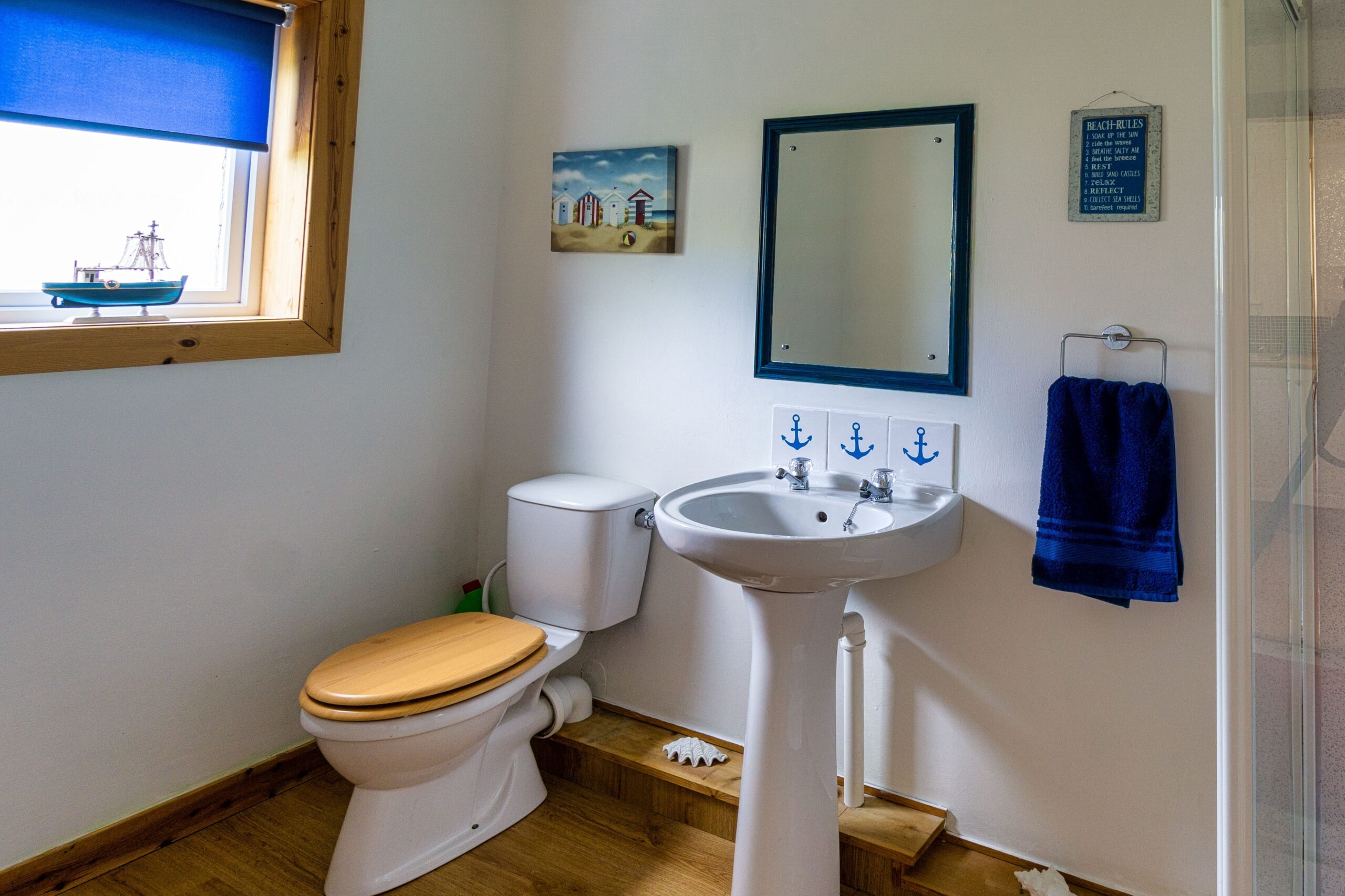 - Bright spacious shower room with WC, wash hand basin, large storage seat for ‘after shower’ dressing, tall toiletries cabinet and heated towel rail.