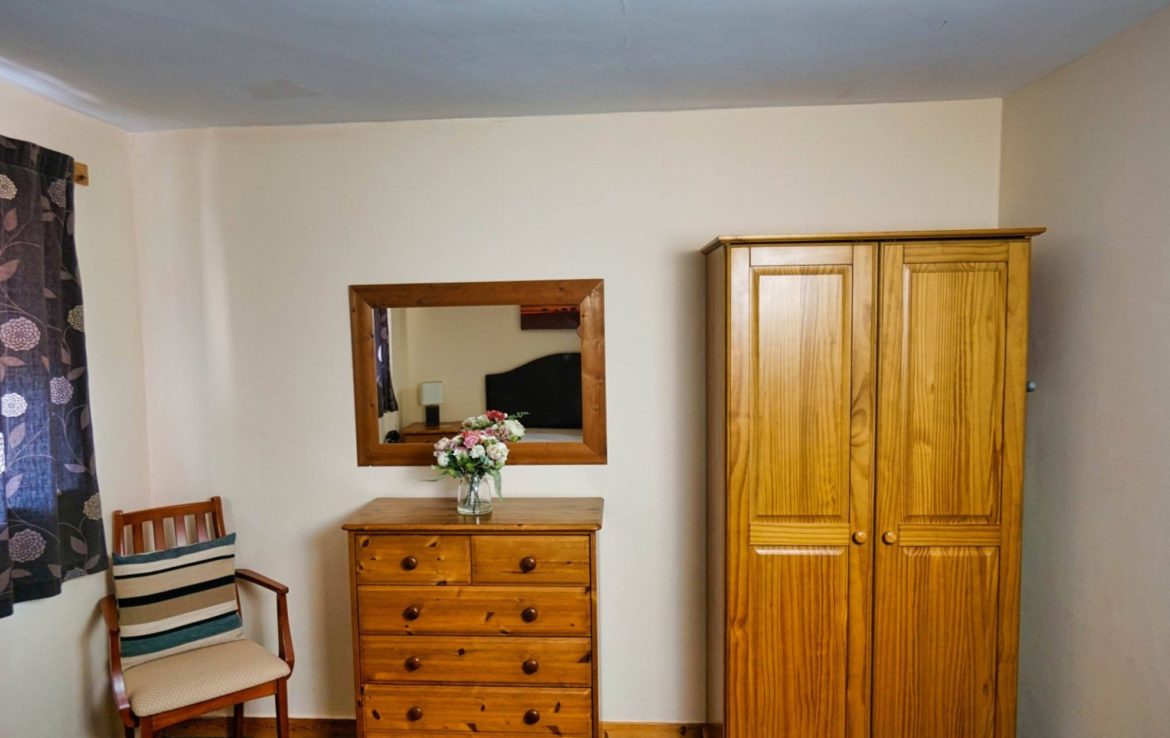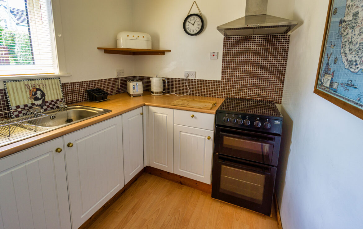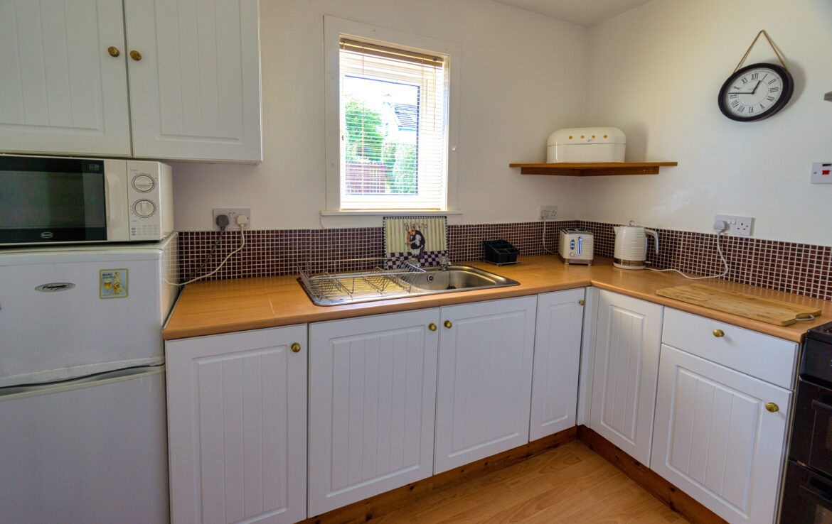 Kitchen bright and modern with ample storage space, microwave, fridge/freezer, and electric cooker. Washing machine is available for use in the owner’s kitchen next door.