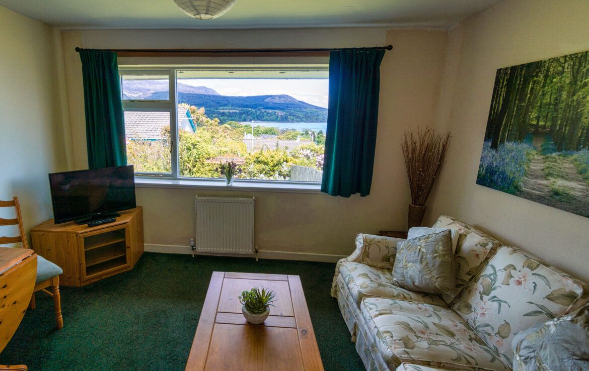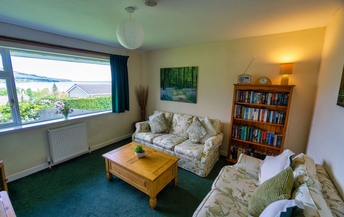 Cosy lounge with comfortable cottage suite and dining table. TV, Netflix, and free Wi-Fi. CD player and digital radio provided. The large lounge window overlooks sea views, and the room is cosy with a large radiator.