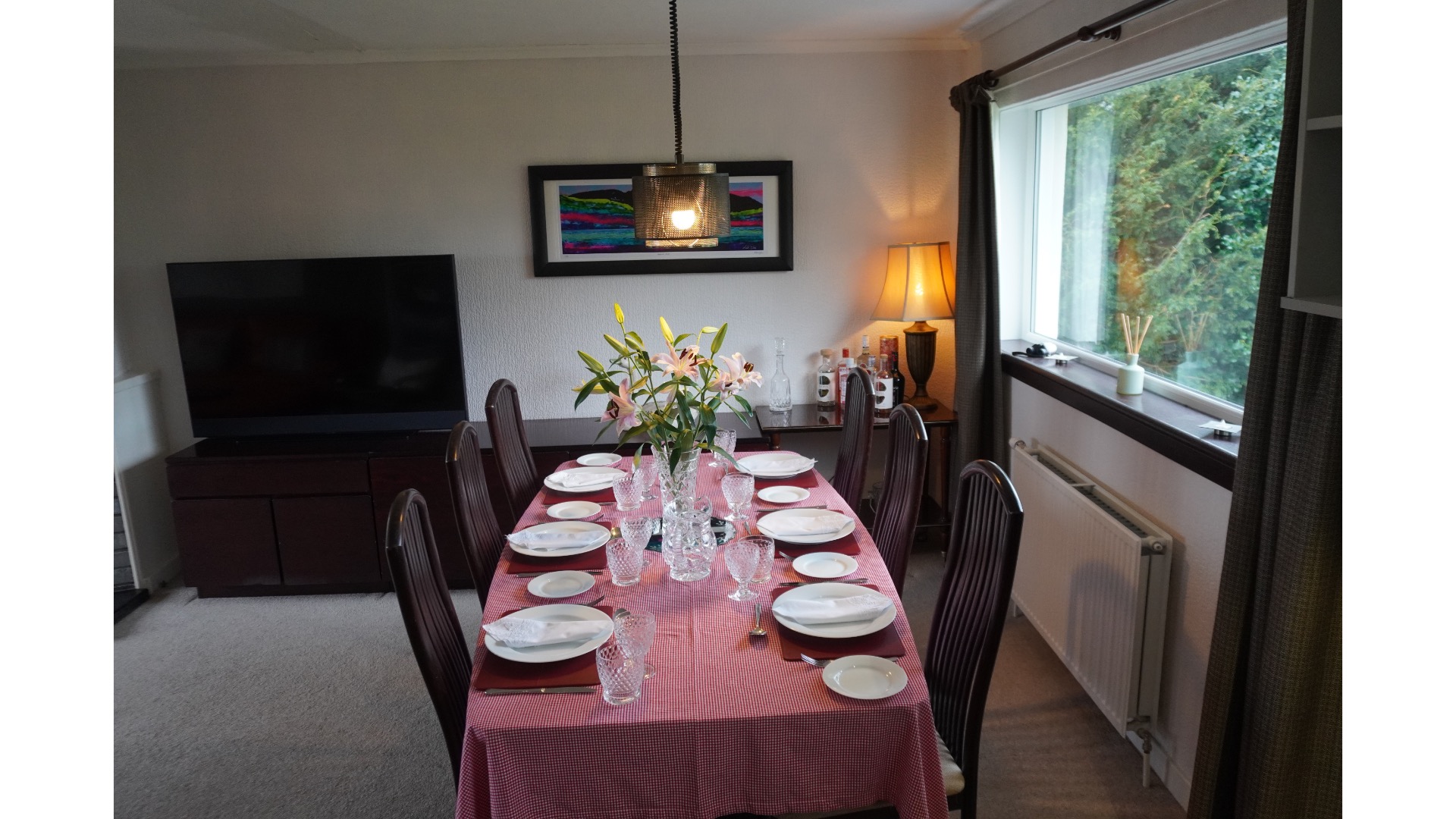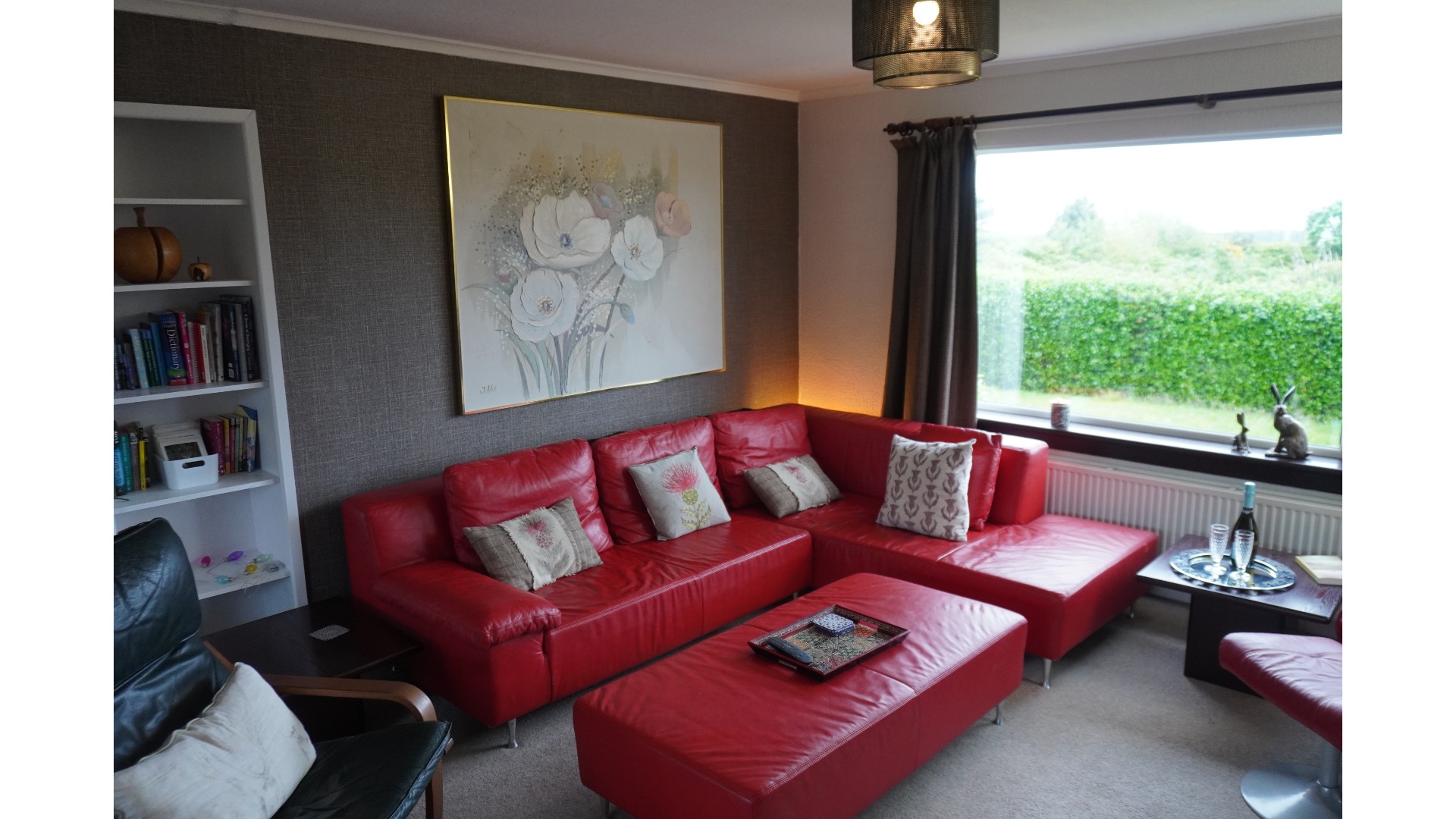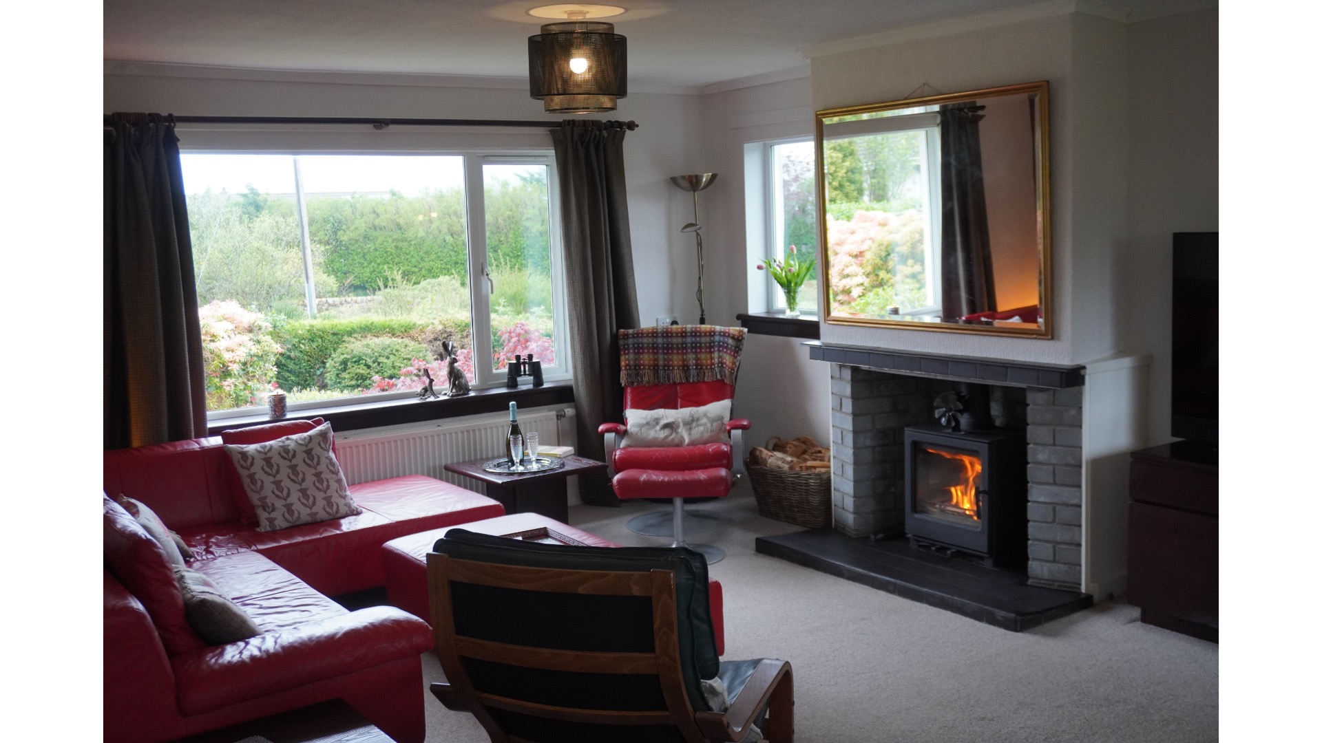 Views over Lamlash Bay to the front and Ross hills to the rear. - Comfortable lounge with Sky Glass tv and wood burning fire opens to dining room with 6 person dining table.
