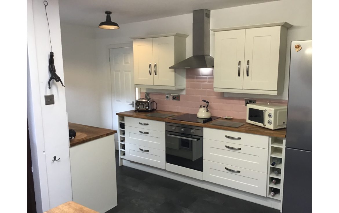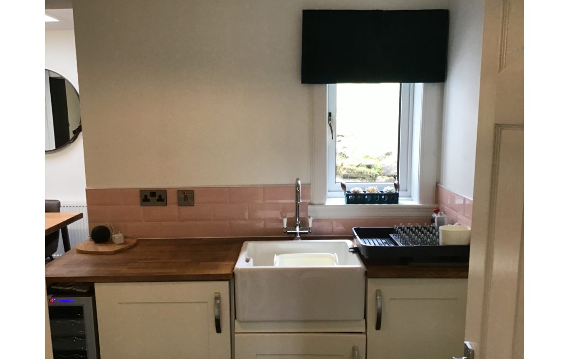 The kitchen is modern and fresh, with a traditional cottage feel. It has a fridge freezer, table and chairs, washing machine, electric hob and oven, microwave, cafetière, toaster, kettle and wine fridge for your wine.