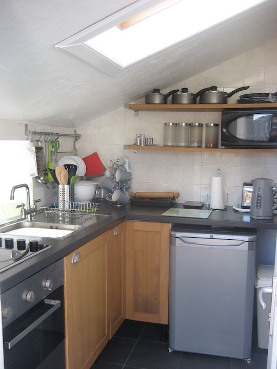 Electric cooker, microwave, kettle, toaster, dishwasher, washing machine, ironing facilities.