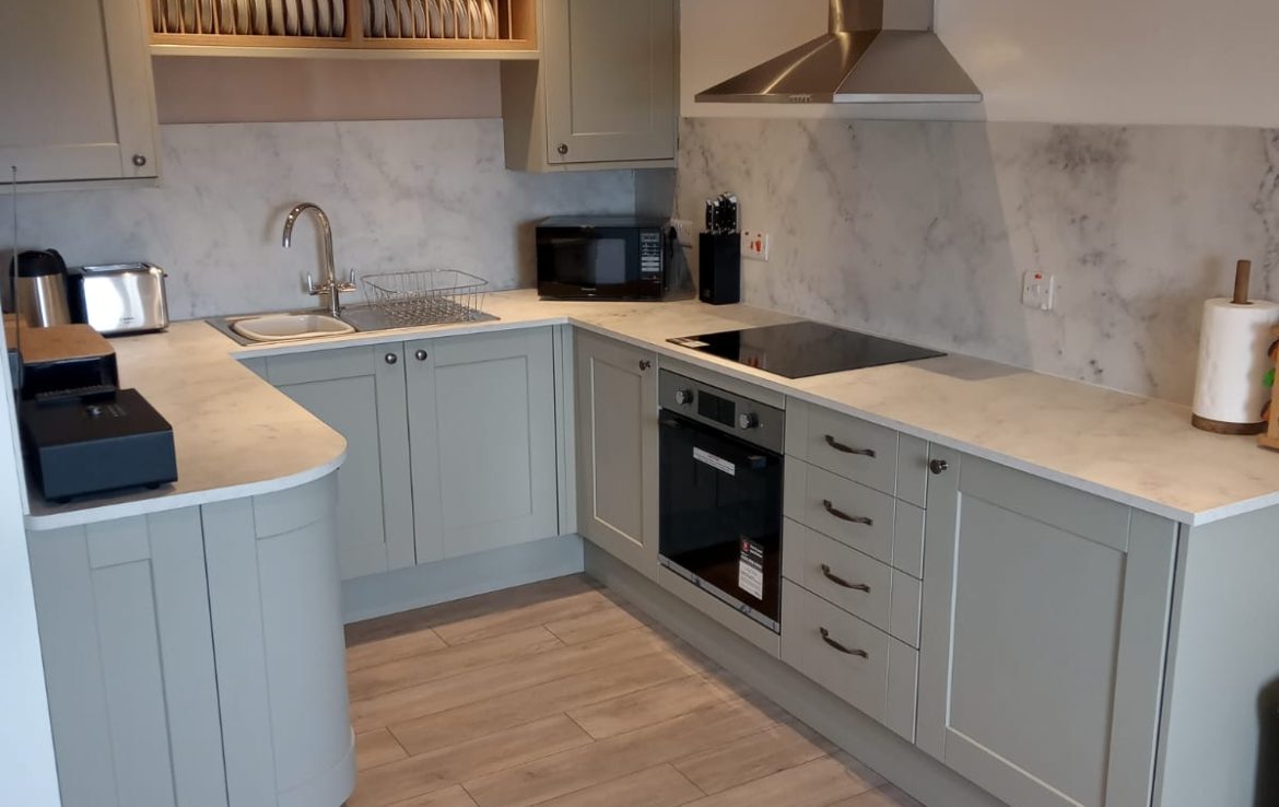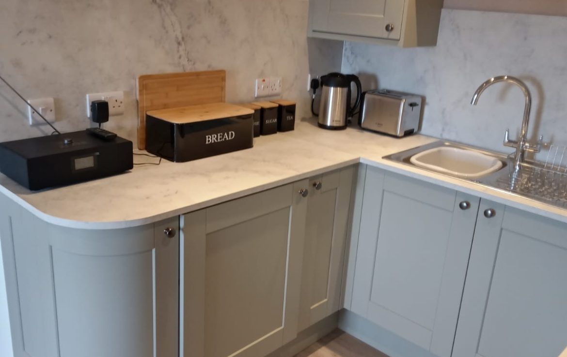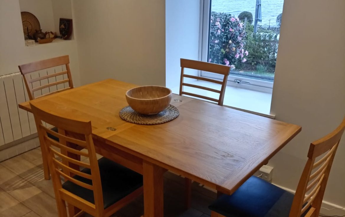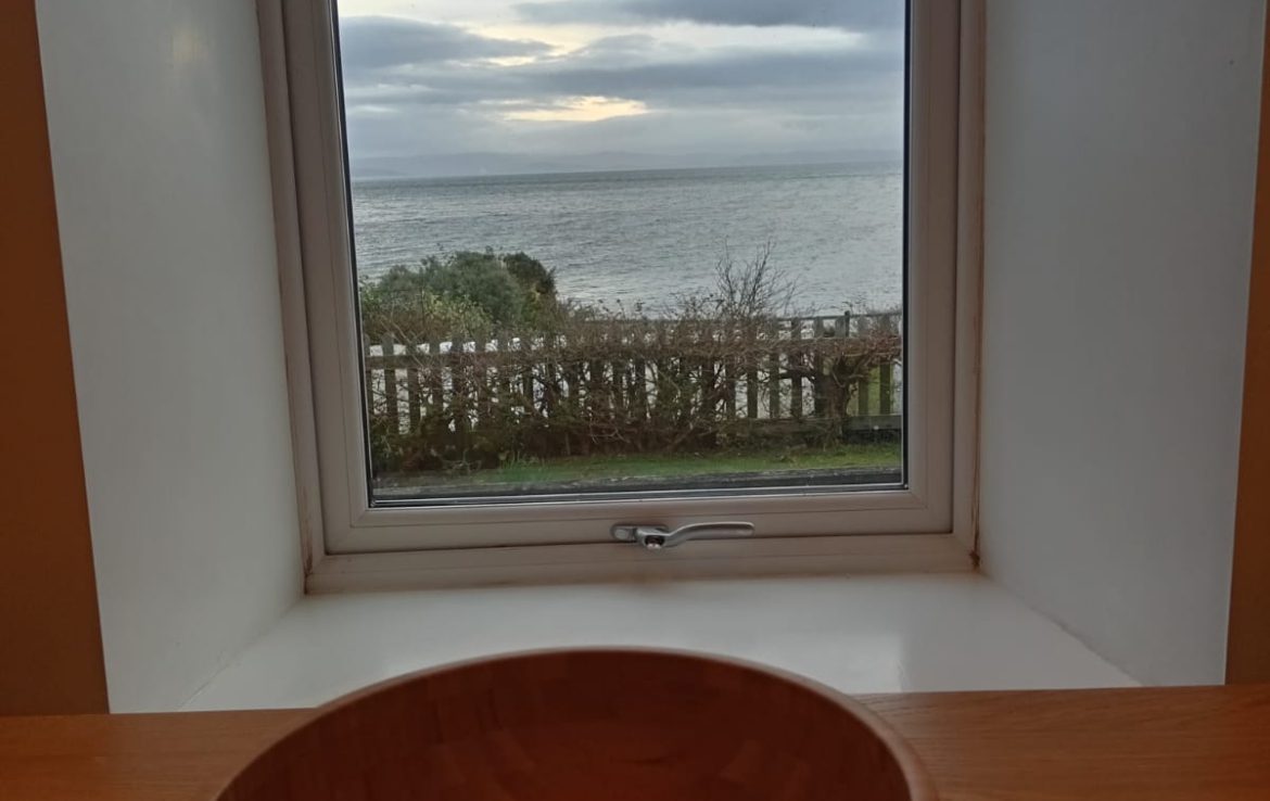 Spacious, open plan kitchen/dining room with washing machine, oven, induction hob, microwave and fridge. Sea view