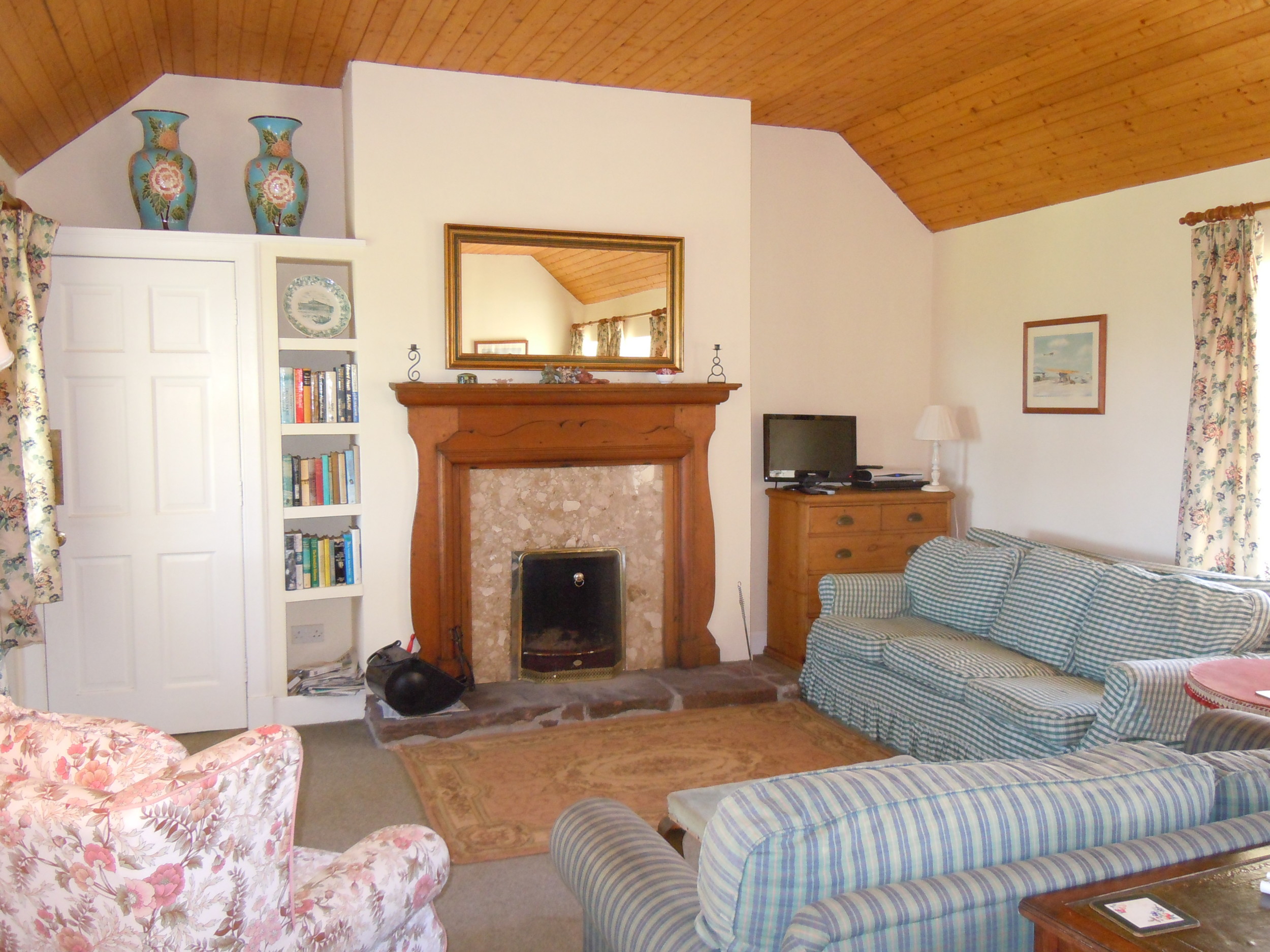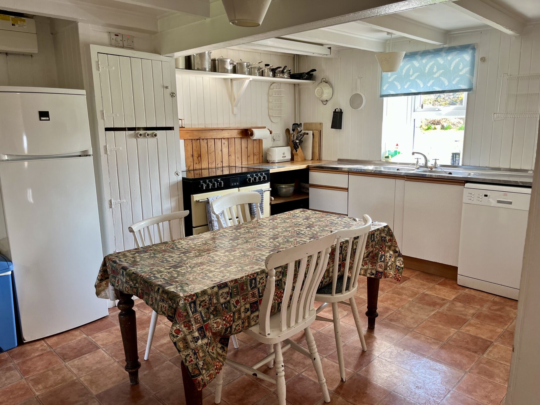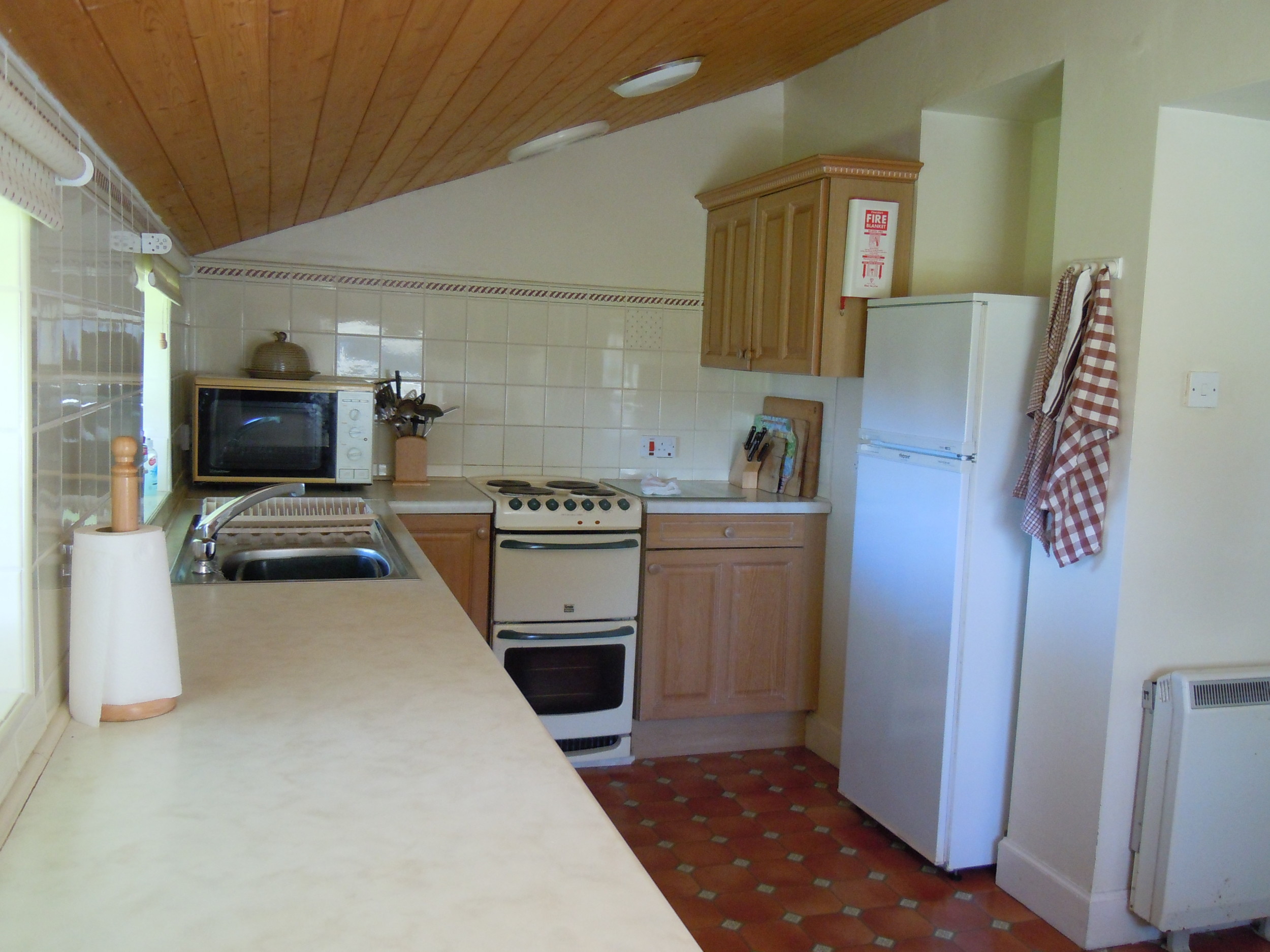 - Modern comforts: There is a fully fitted kitchen adjacent to the hall/dining room with electric cooker, fridge/freezer, dishwasher and microwave. There are a lot of spacious living areas within the property. The dining room has an open fireplace, dining table, board games and door to the garden. The large sitting room up two steps from the dining room, has an open fireplace and vaulted ceiling. There is a flat screen television with Sky Freeview and a DVD player provided. There is a utility room with a sink, washing machine, tumble dryer, ironing facilities and a coat rack in the hallway. There is also a W/C off the utility. Wi-Fi is available.