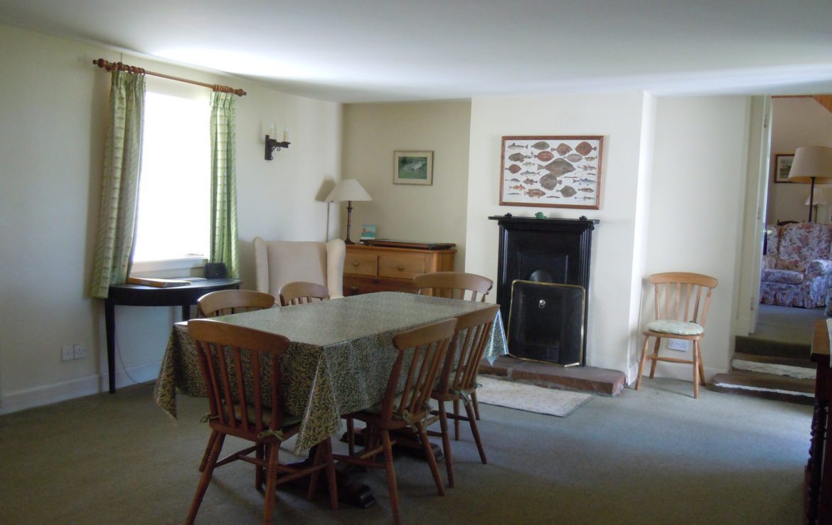 The hall/dining room has an open fireplace, dining table and door to the garden. The wi-fi router is located here.