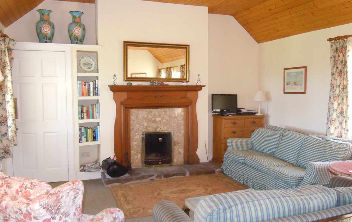 The large sitting room has an open fireplace and vaulted ceiling. There is a flat screen television with Sky Freeview and a DVD player provided.