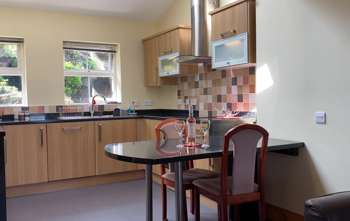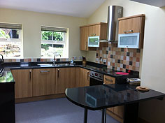 Fully fitted kitchen with modern appliances including electric oven, hob and grill, dishwasher, microwave and fridge.