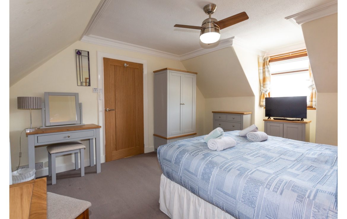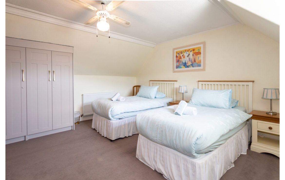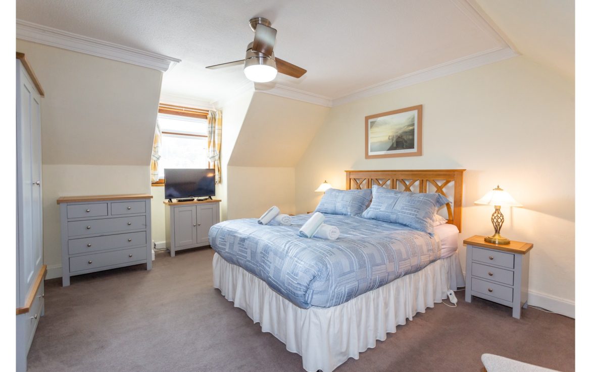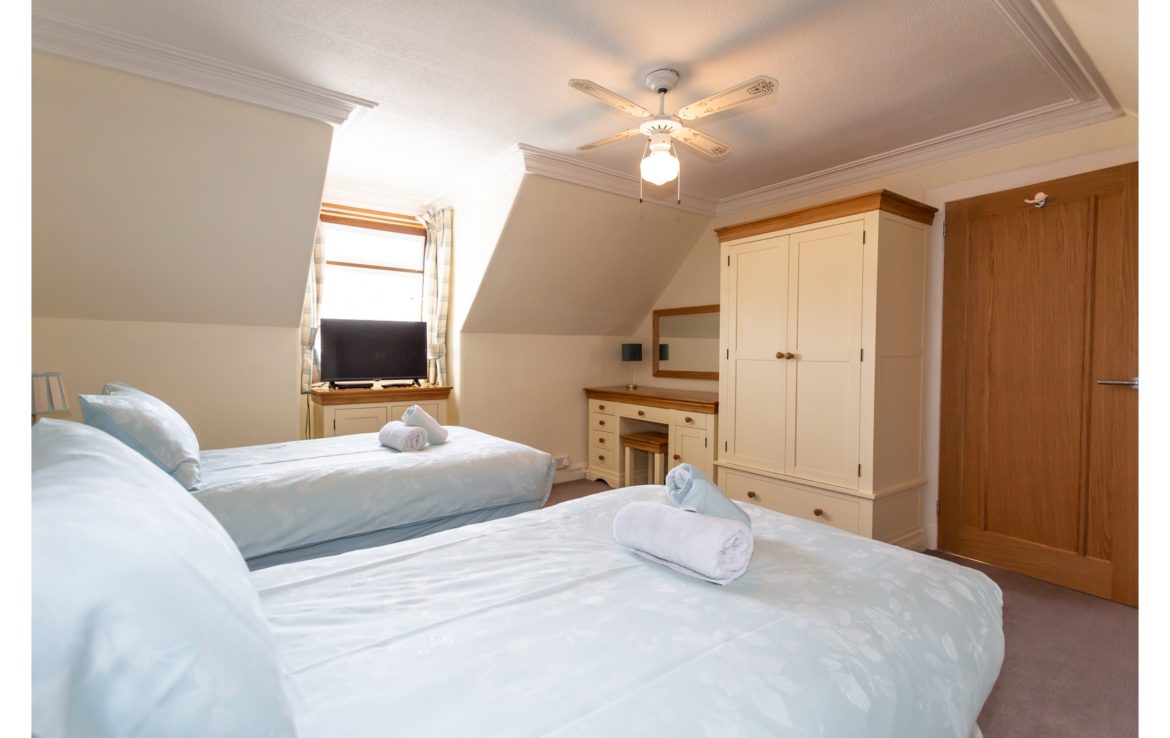 Upstairs there are two bedrooms one double and one twin both with TV and ceiling fans.