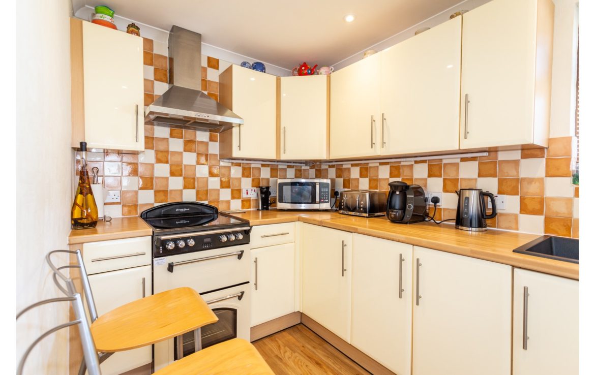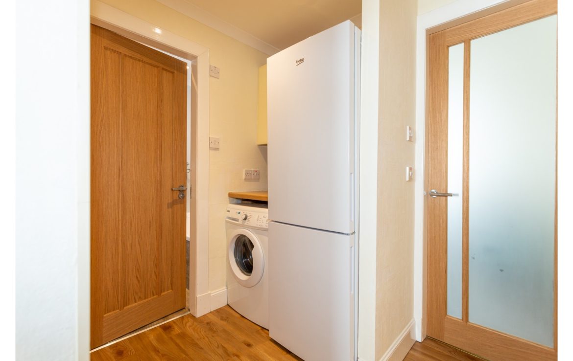 Kitchen has electric twin oven with grill, fridge freezer, washing machine, tumbler dryer, dishwasher and microwave.