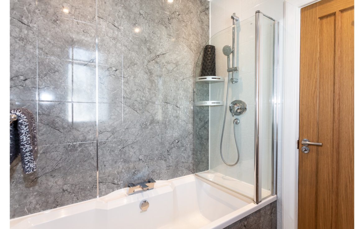Bathroom with bath and shower over bath, electric razor and toothbrush point.