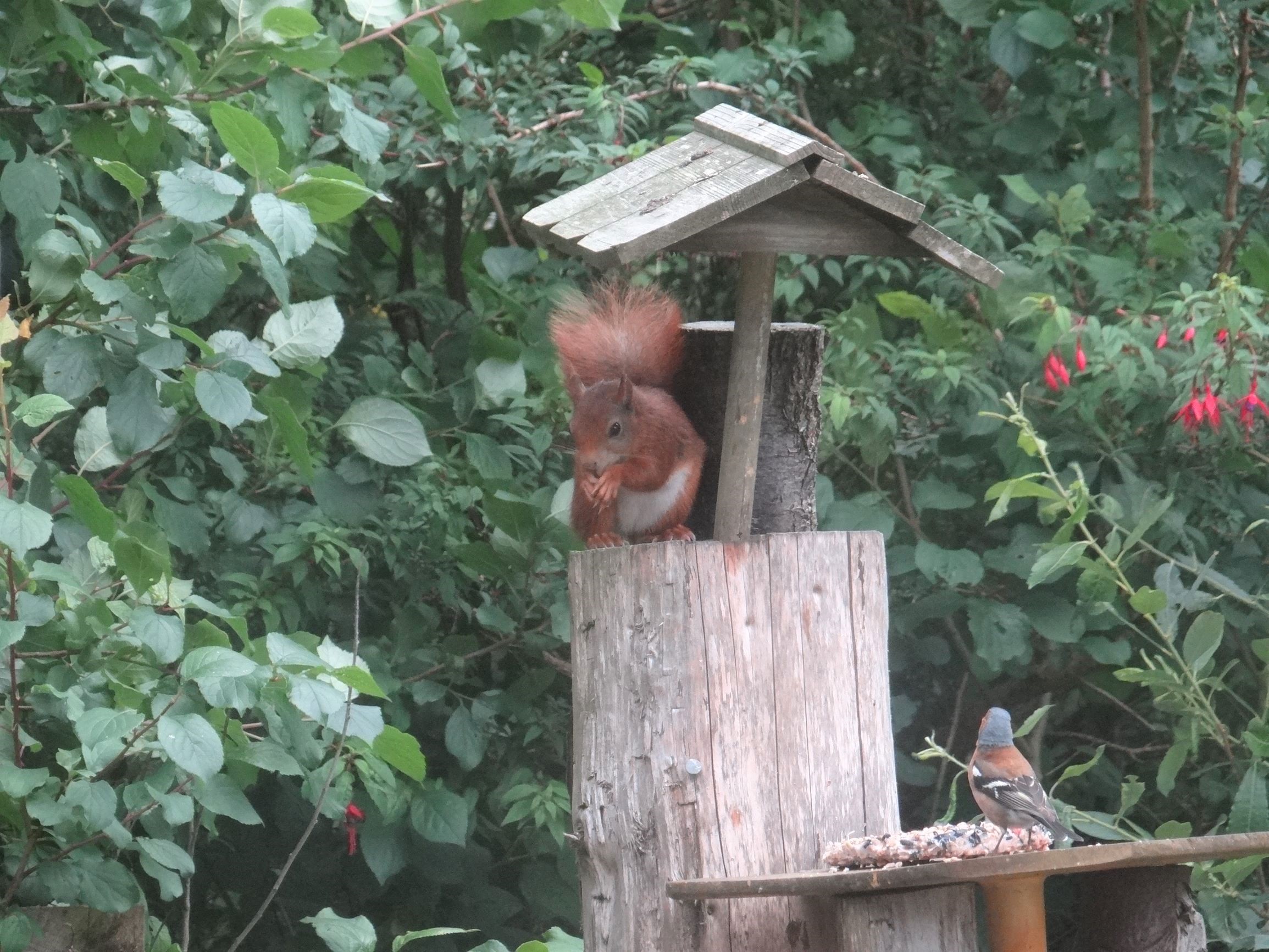 - Watch red squirrels frolic in the garden while eating nuts put out for them.
